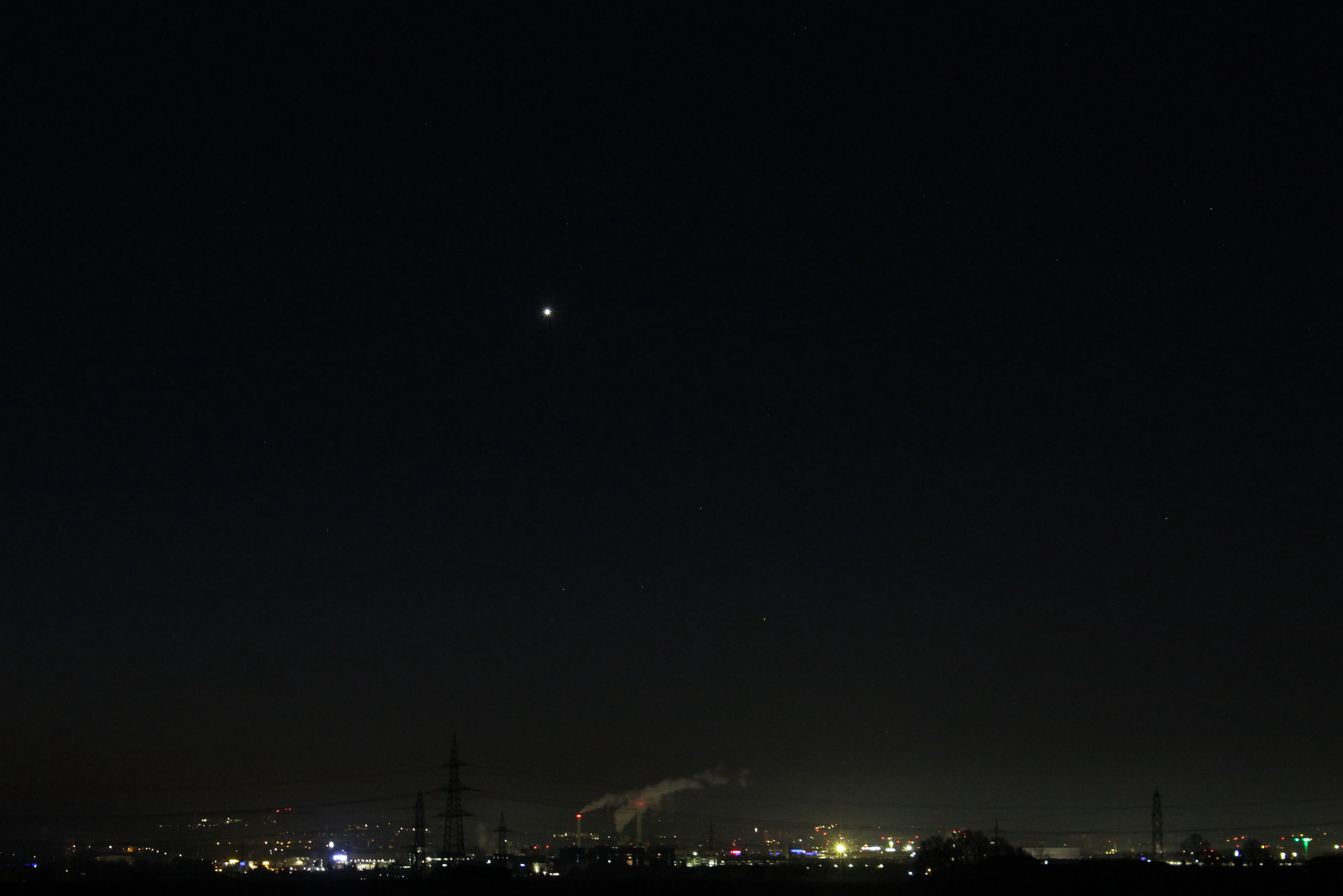 Venus und Mars am Morgenhimmel, aufgenommen westlich des Sindelfinger Ortsteils Maichingen. Im Vordergrund ist Sindelfingen zu sehen.