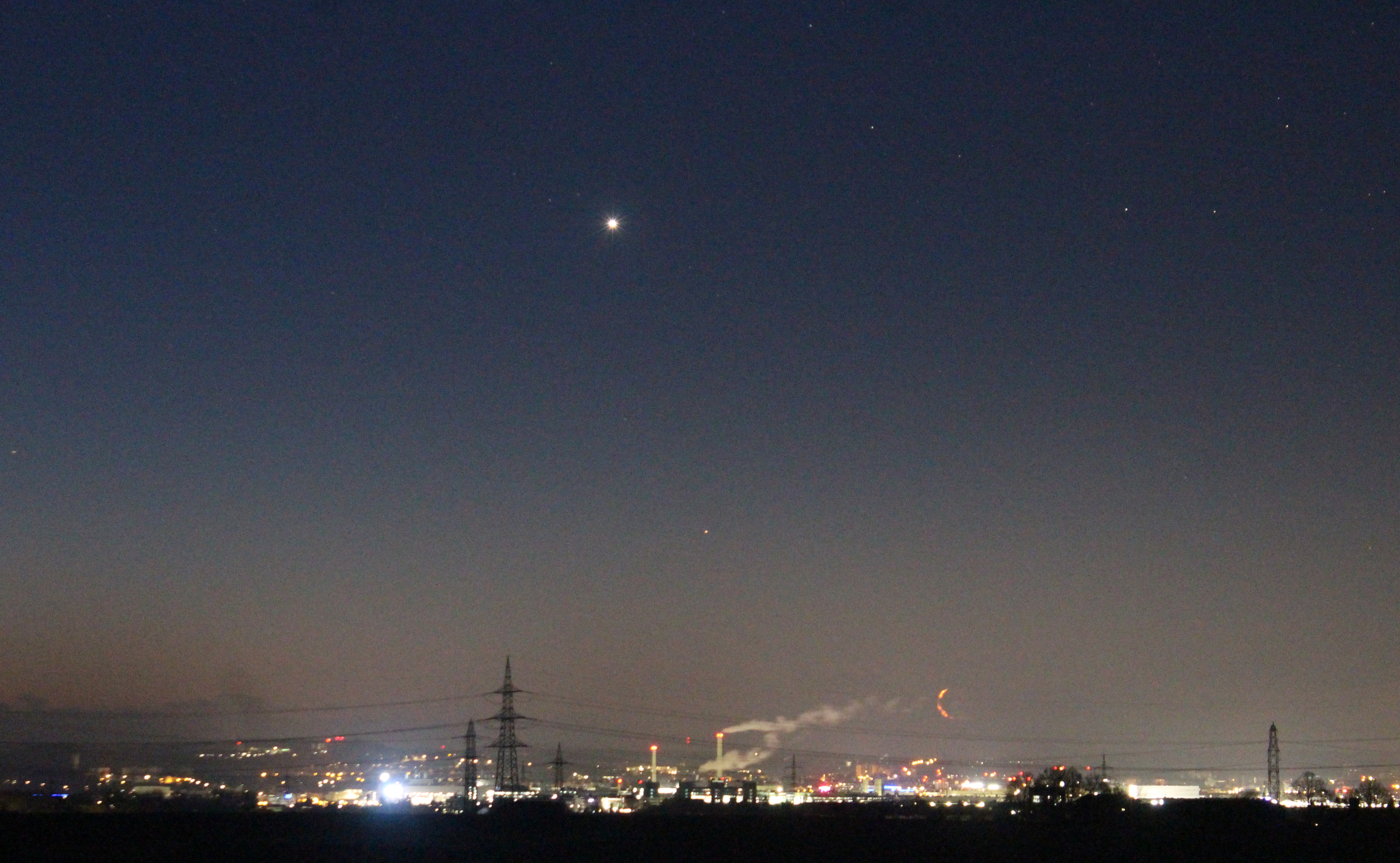 Venus und Mars am Morgenhimmel über Sindelfingen, aufgenommen westlich des Sindelfinger Ortsteils Maichingen mit längerer Brennweite. Man erkennt deutlich die Sichel des abnehmenden Mondes hinter der Dampffahne des 120 Meter hohen Kamins des Mercedes-Benz Werks in Sindelfingen.