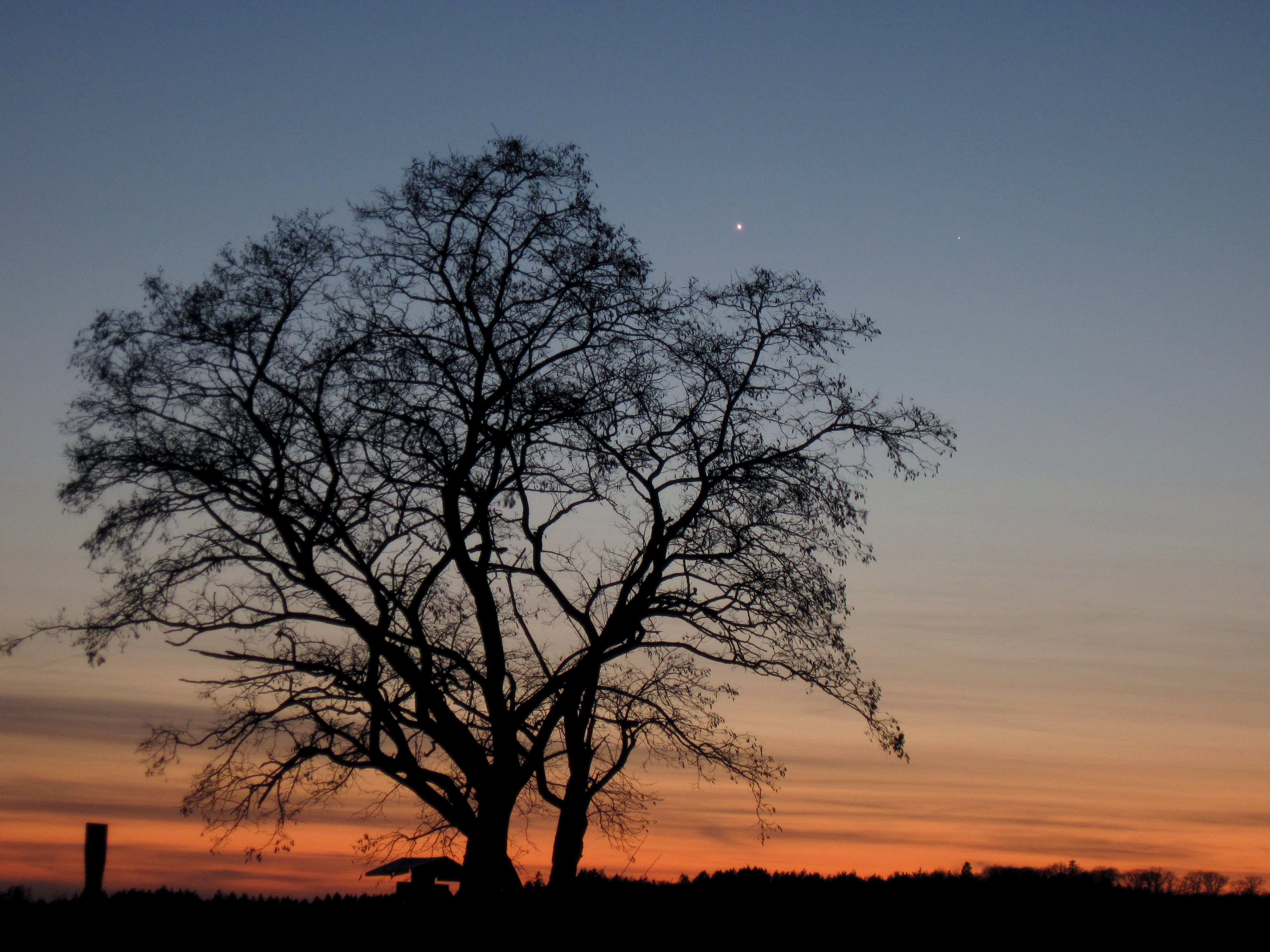 Am 6. April 2010 konnte man in der Abenddämmerung neben der Venus als hellem Abendstern auch den Planeten Merkur mit bloßem Auge sehen. In Lebach (Saarland) gelang mir diese stimmungsvolle Aufnahme der beiden Planeten.