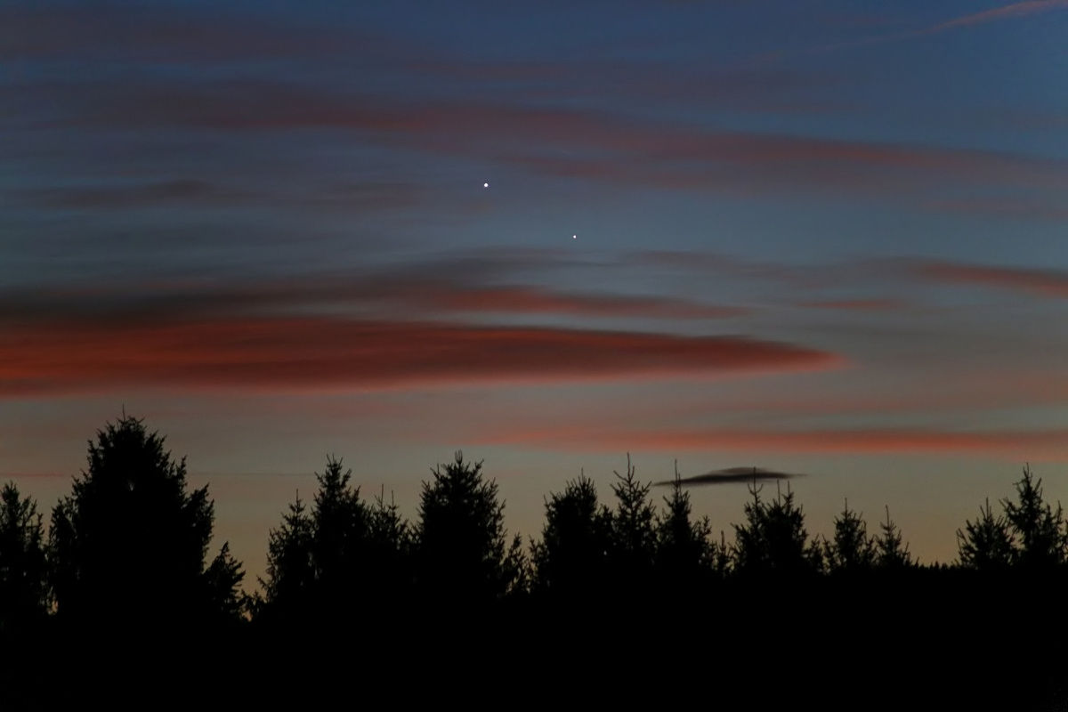 Kurz vor dem nächsten heranbrausenden Sturmtief gab es am Abend des 10. Jänner 2015 noch relativ gute Horizontbedingungen für die Konjunktion Venus und Merkur. Der Abstand der beiden Planeten betrug 0.6 Grad. http://www.astromethyst.at