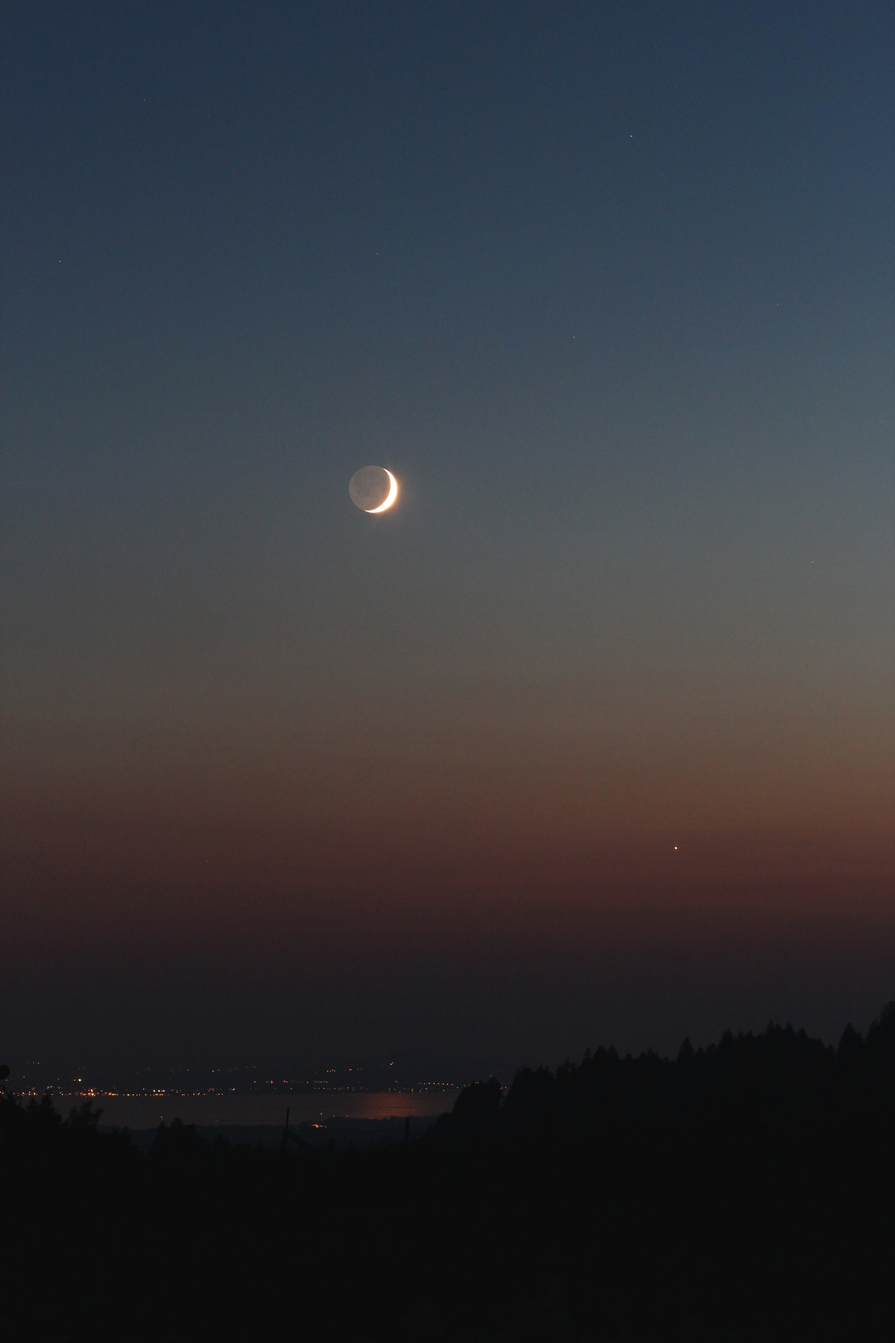 Mond und Venus gaben sich heute Abend ein kleines Stelldichein über dem Bodensee, welcher von Scheidegg aus teilweise zu sehen ist. Strategisch günstig (oder ungünstig - je nachdem wie man es sehen mag) positionierte ich die Kamera zwischen Fahrradweg und einer vielbefahrenen Durchgangsstraße und konnte so einen aktiven Beitrag zur Verkehrssicherheit leisten. Einige motorisierte Verkehrsteilnehmer bremsten spürbar ab, um sich an die ausgewiesene Höchstgeschwindigkeit zu halten. Neben Venus und Mond mitsamt aschgrauem Licht sieht man im Vordergrund das deutsche und im Hintergrund das schweizerische Bodenseeufer um Romanshorn.