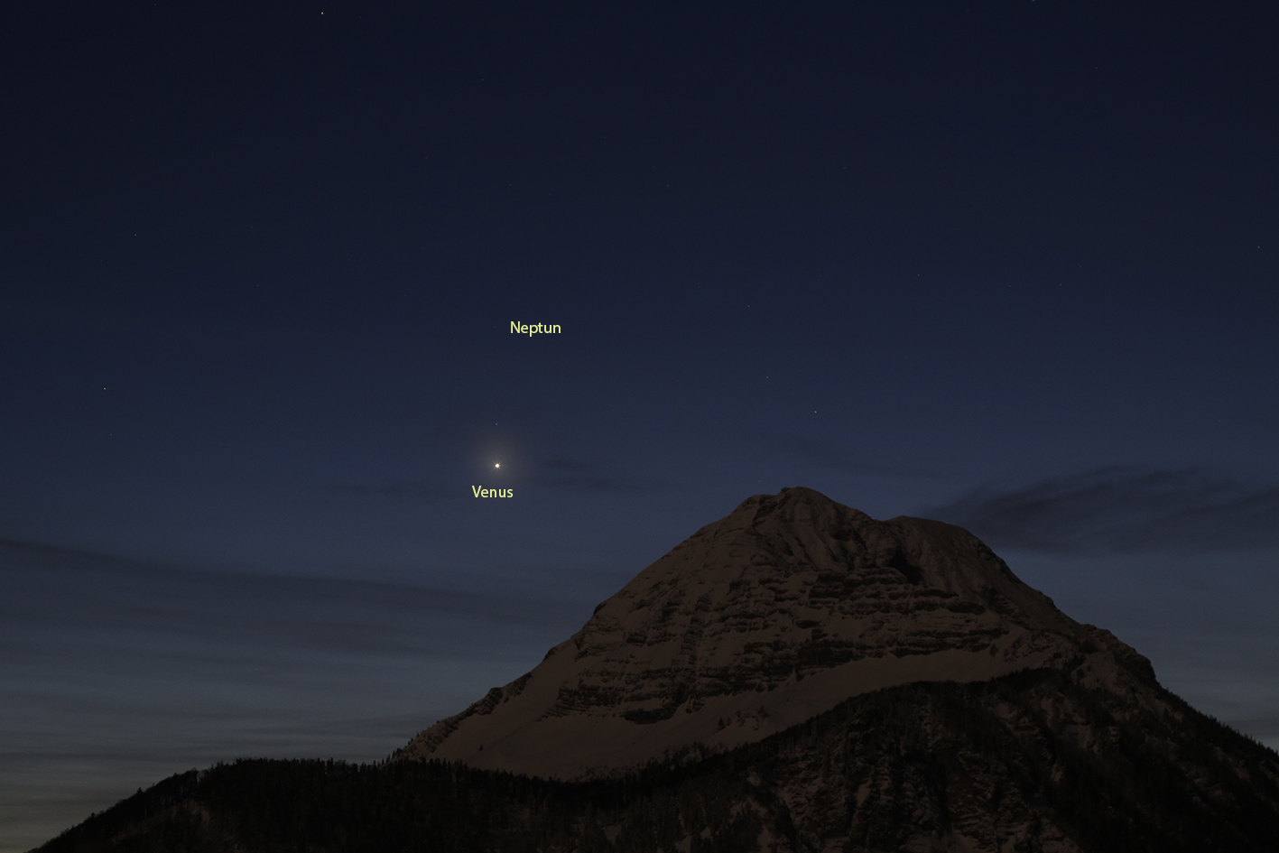 Venus über dem Ötscher habe ich an vielen Abenden von Jänner bis März verfolgt und dabei auch die Verlagerung der Ekliptik beobachten können. In dieser Aufnahme habe ich auch den lichtschwachen Neptun über Venus entdeckt.