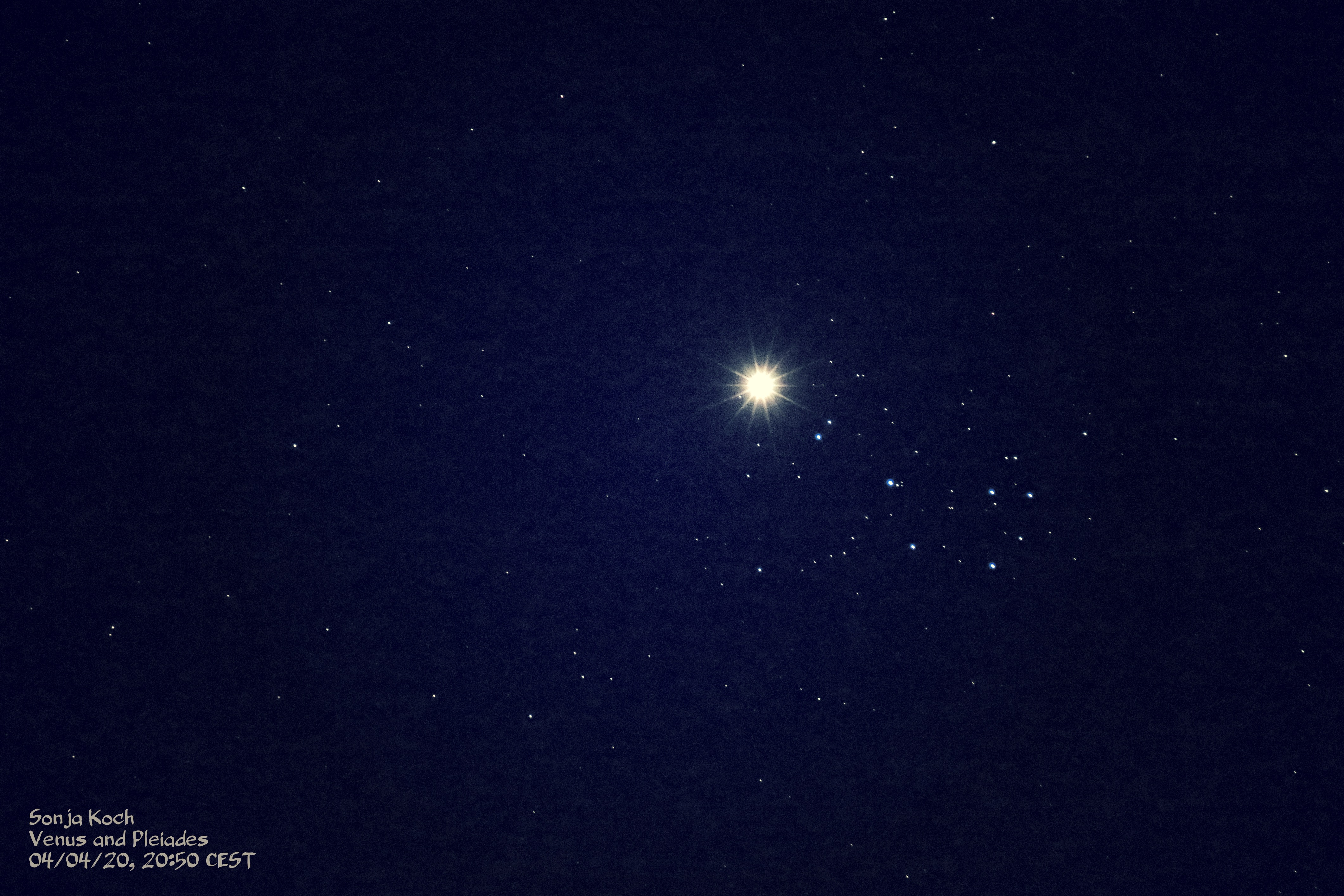 Noch ein kleiner Beitrag zum Thema „Himmelsbeobachtung von zu Hause aus“: Zum Glück spielte das Wetter mit, so dass ich mit meiner Kamera festhalten konnte, wie die Venus bei den Plejaden stand.