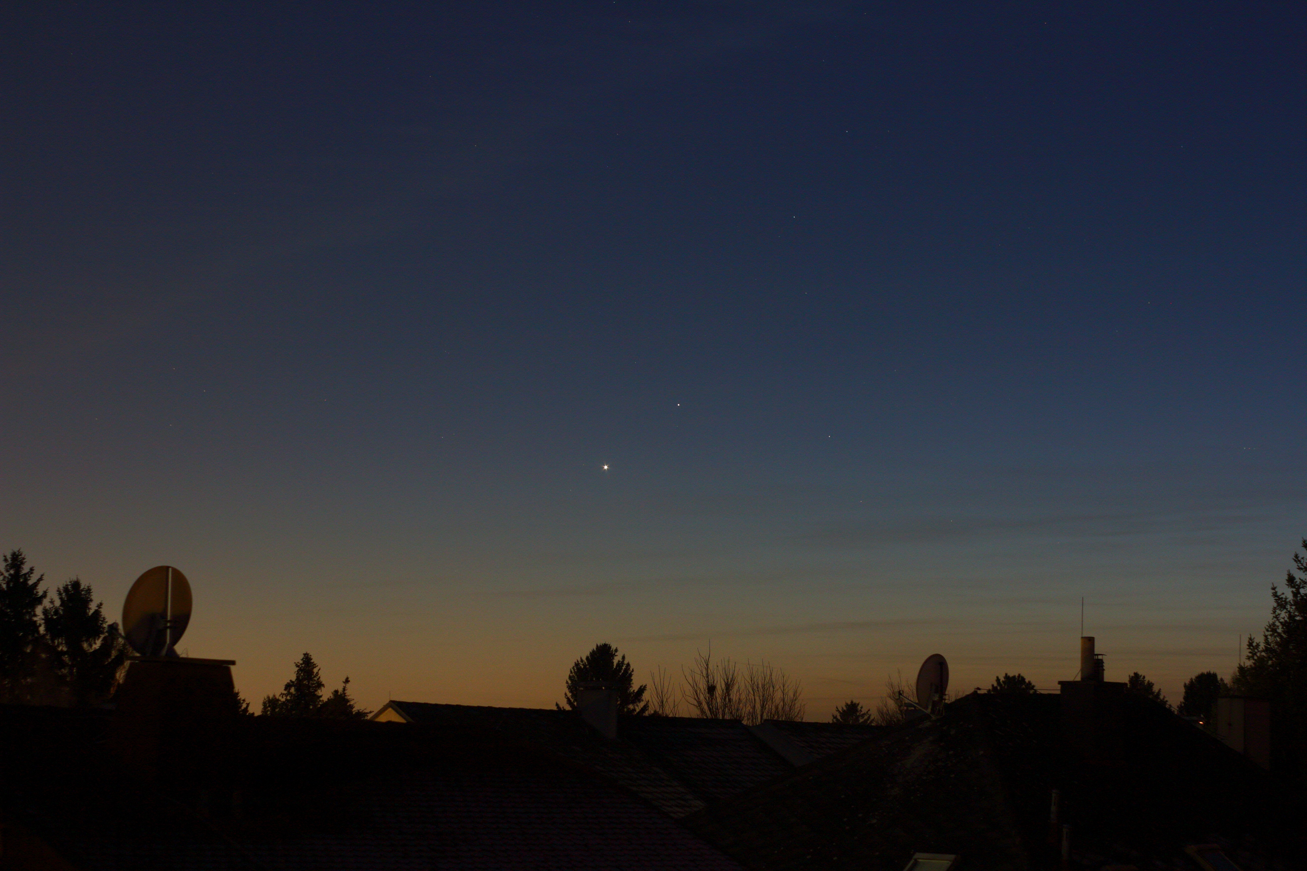 Mit freiem Auge war das Planetenpaar am besten zwischen 17:10 und 17:20 Uhr MEZ zu sehen. Die Winkeldistanz betrug knapp weniger als eine Daumenbreite in der Weite des ausgestreckten Arms, die Rechnung ergibt 1,8 Grad.