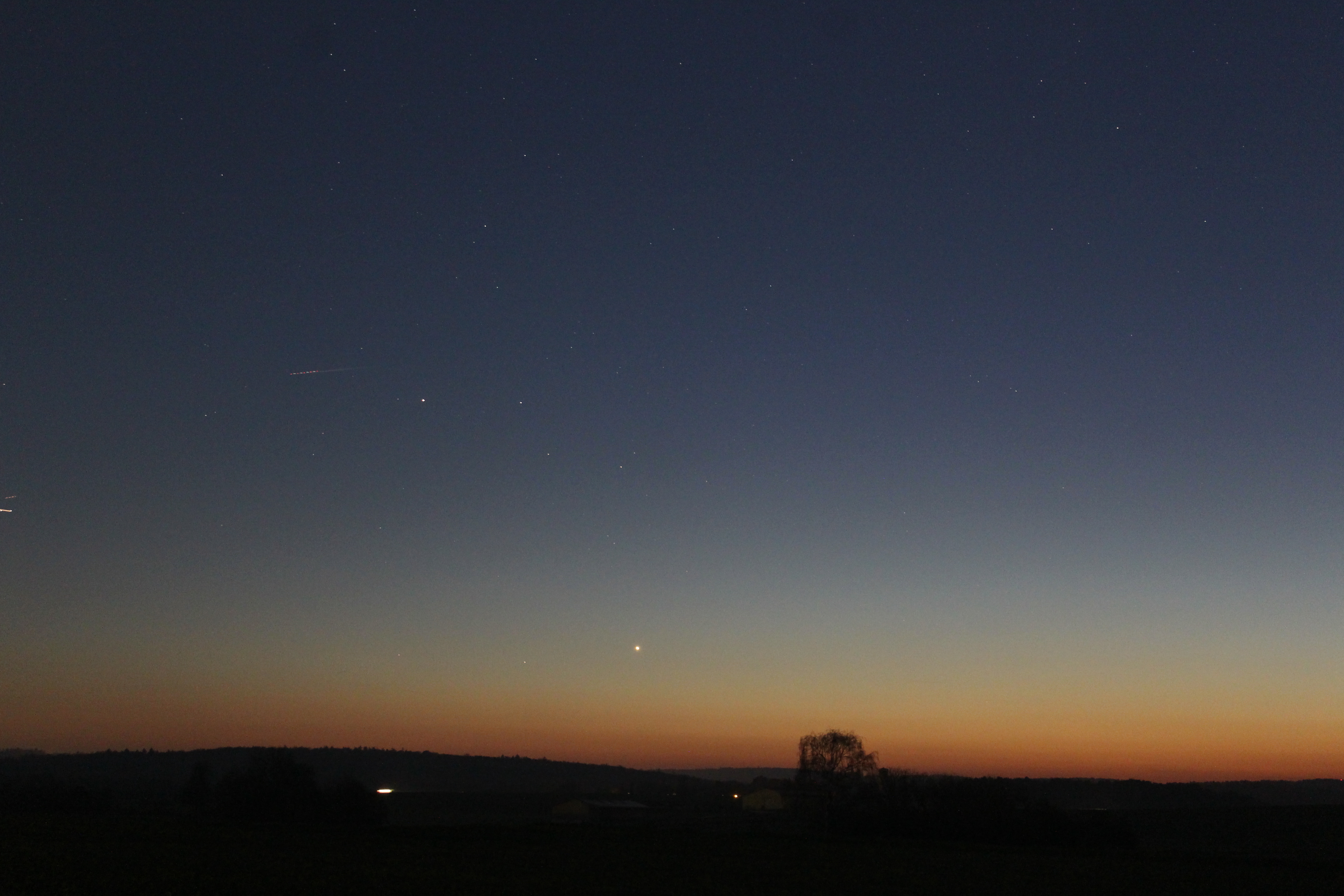 Venus und Saturn in der Abenddämmerung, fotografiert auf einem Feld zwischen dem Sindelfinger Ortsteil Maichingen und dem Grafenauer Ortsteil Döffingen.