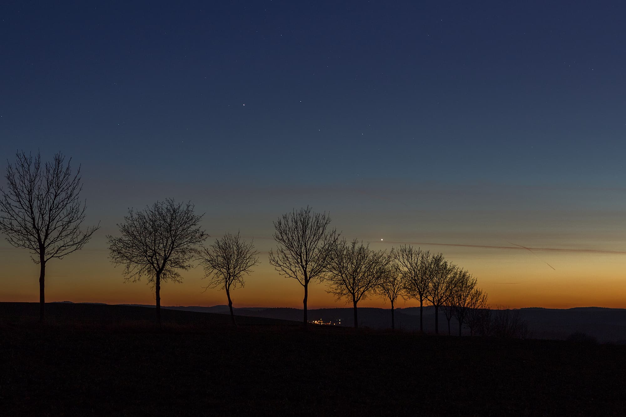 Am 04.12.2019 gab es nach etlichen Tagen mit dichtem Nebel und Novembergrau mal wieder eine herrliche Abenddämmerung, die ich nutzen musste, um Venus und Saturn abzulichten. Nachdem ich aus beruflichen Gründen die schöne Konstellation von Mond, Venus und Jupiter nicht habe beobachten und fotografieren können, war dies ein schöner »Ersatz« dafür. Zum Zeitpunkt der Aufnahme waren Venus und Saturn noch acht Grad voneinander entfernt, nähern sich aber in den folgenden Tagen weiter an. Mit den Sternen des untergehenden Schützen bildete Saturn eine hübsche Konstellation.