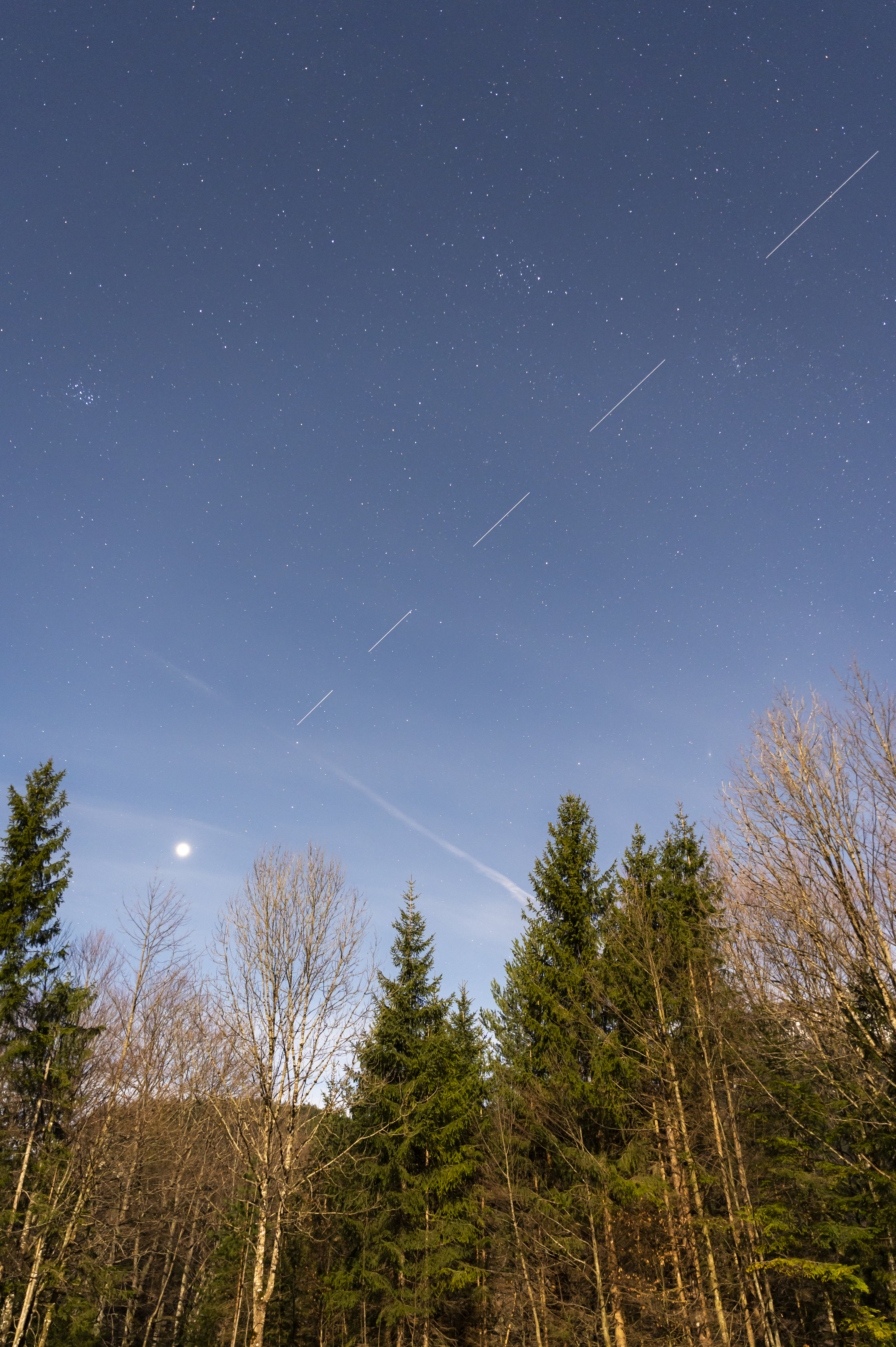 Über dem Waldrand scheint unübersehbar hell die Venus, darüber zieht eine Kette Starlink-Satelliten ihre Bahn und hinterlässt eine Reihe an Strichspuren auf dem Foto.