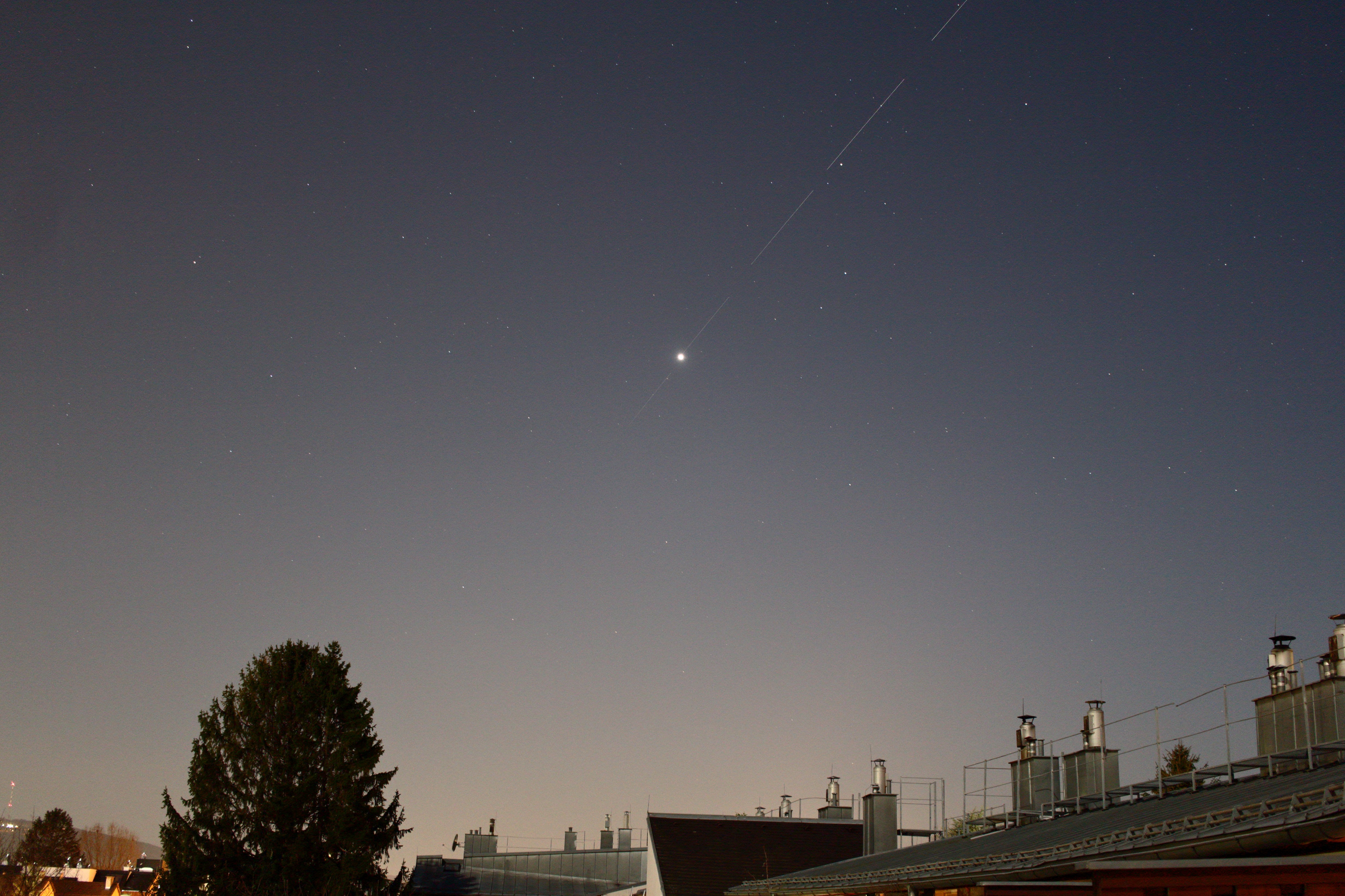 8. März 2020: gegen 19:50 Uhr MEZ war Uranus gut neben Venus im Fernglas 10x50 sichtbar (links unterhalb). Die nahe der Venus alle paar Sekunden auftauchenden Satelliten wirkten wie eine Invasion am Nachthimmel. Die Belichtungszeit von zehn Sekunden erzeugte die Satelliten-Strichspuren.