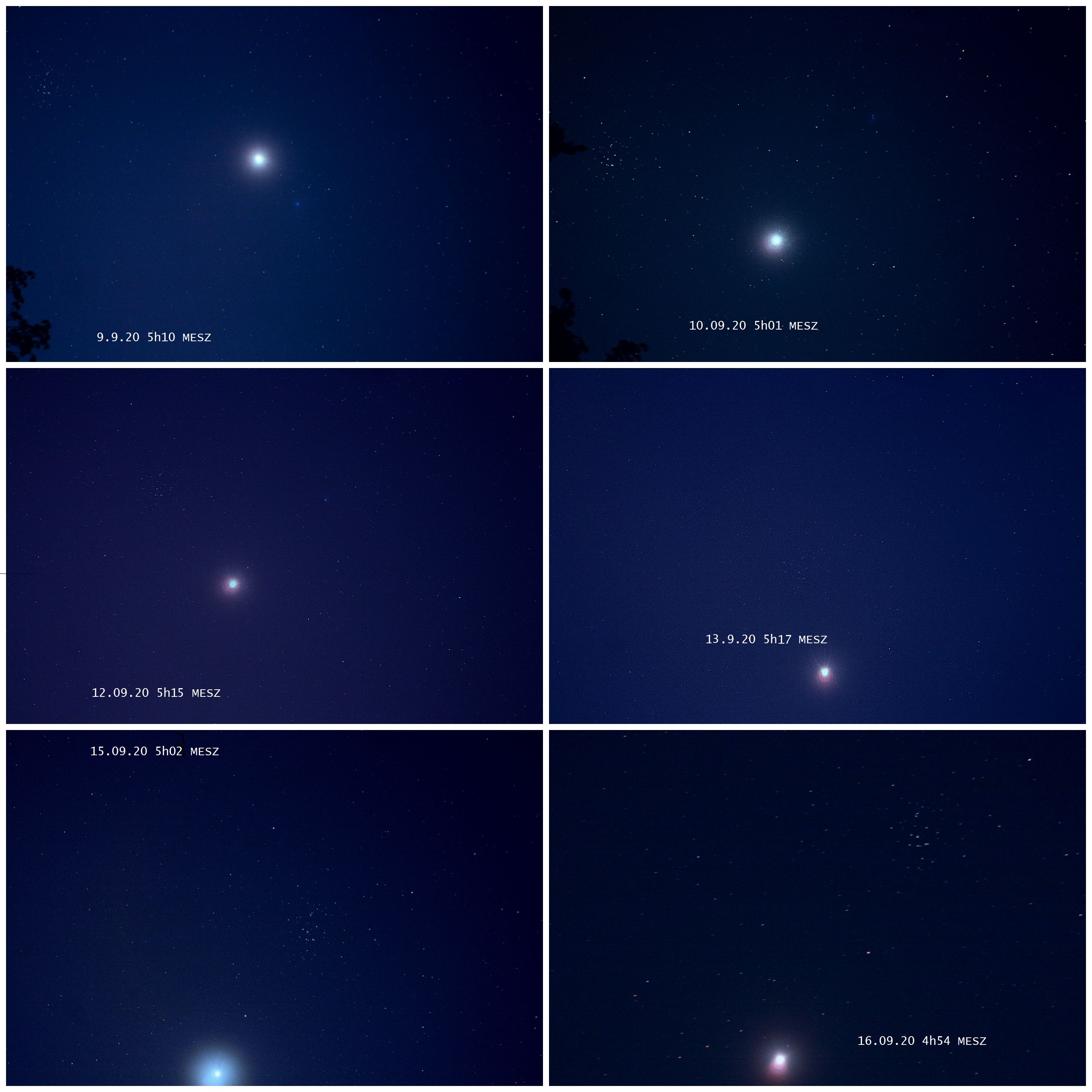 Venus strahlend hell am Morgenhimmel und Messier 44 in der Nähe der Venus, sowie eine längere Schönwetterperiode. Somit gelang es hier in Krems, NÖ die Bewegung der Venus vorbei an Praesepe gut zu beobachten und diese Collage zu erstellen.