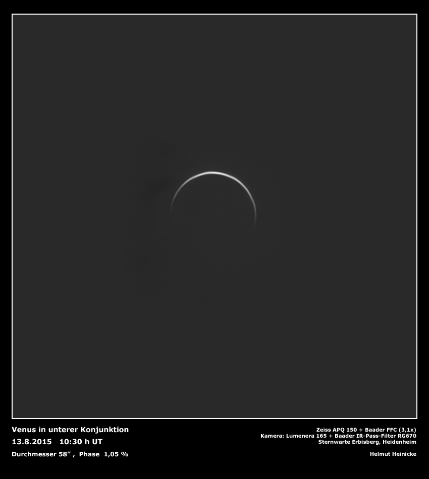 Bereits zwei Tage vor der unteren Konjunktion habe ich diese Aufnahme gemacht - zum Glück, denn am Tag der Konjunktion war der Himmel bedeckt. Die Phase betrug 1,05 Prozent. Verwendet wurde der Zeiss APQ150 der Volkssternwarte Heidenheim. Mit dem Shutter des Kuppelspalts wurde die Sonne abgedeckt, und wegen der großen Luftunruhe der Baader IR-Passfilter RG670 verwendet.