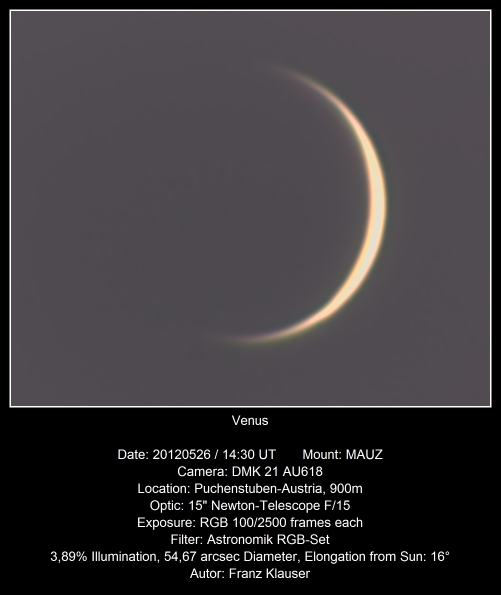 Zum Aufnahmezeitpunkt war die Venus 0,31 AE oder 45,66 Millionen km von der Erde und 0,72 AE von der Sonne entfernt. Zwar ist die Planetensichel schon 54,67 Bogensekunden groß, dafür aber nur mehr 3,89% beleuchtet, eine Folge von nur mehr 16,06 Grad Elongation von der Sonne.