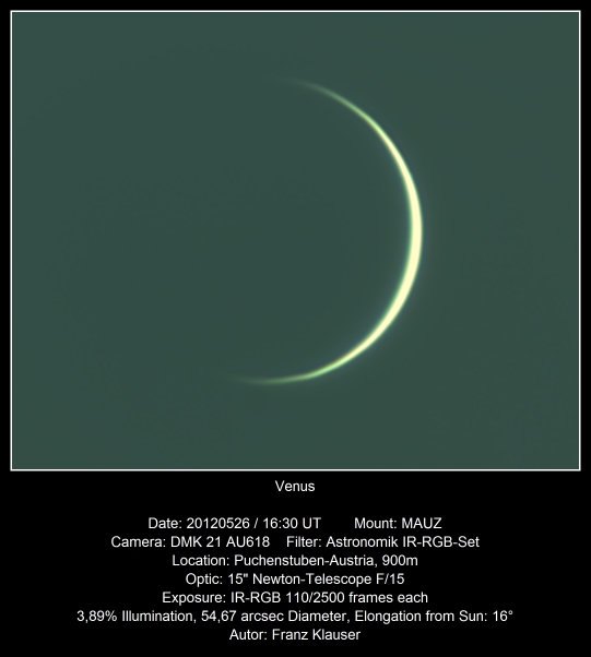 Erst am späten Nachmittag des 26.5.2012 besserten sich die Bedingungen, um die Venus aufzunehmen. Vor allem die Sichelspitzen sind gegen Luftunruhe sehr anfällig. Verwendungsrate 110 Bilder von jeweils 2500 in RGB und 110 von 4300 in IR.