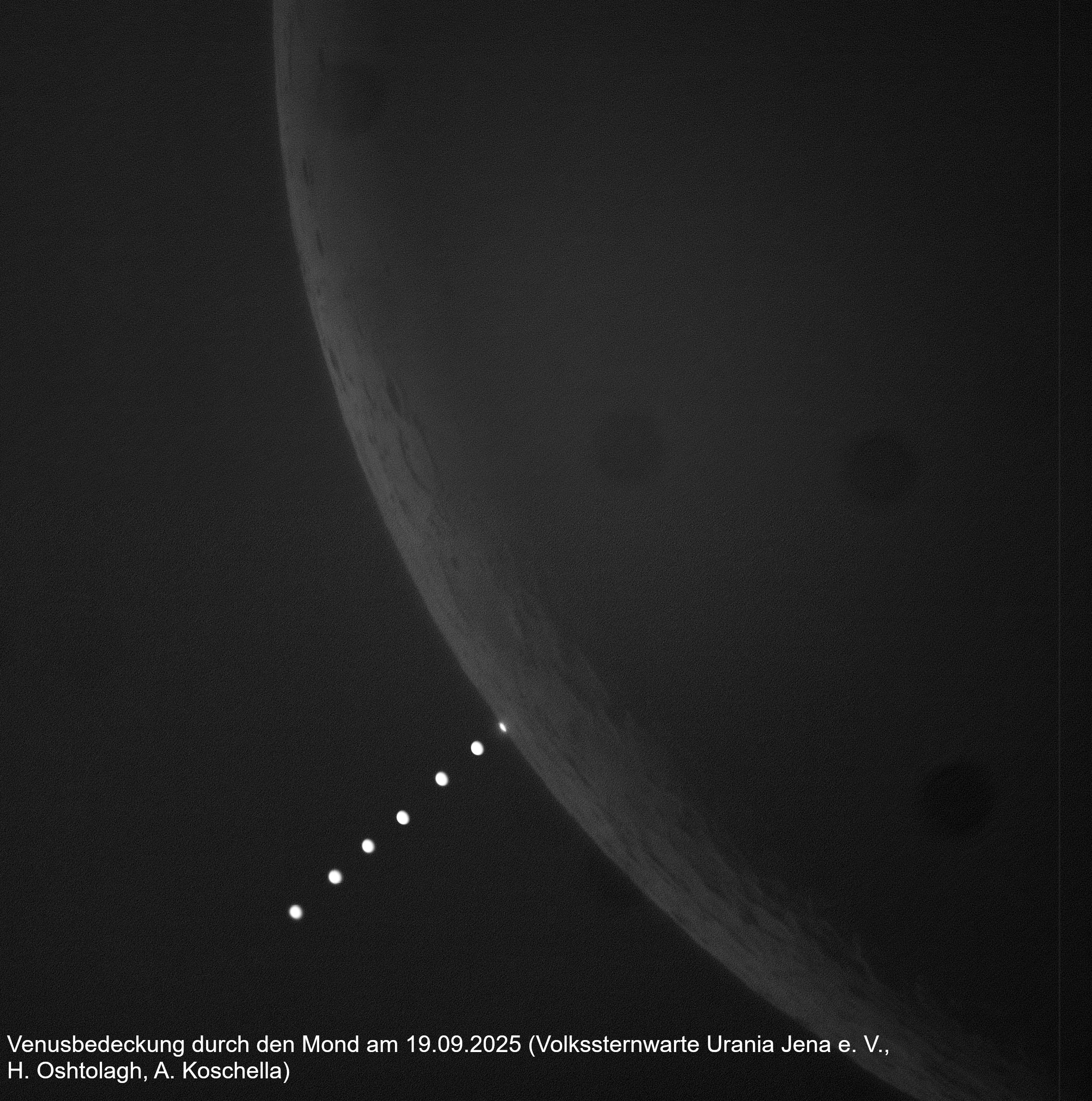 Zur Aufnahme der Venusbedeckung wurde der Coudé-Refraktor (150/2250) der Urania-Sternwarte in Kombination mit der Kamera ZWO ASI 2600 MC Pro benutzt. Unter Anwendung des Lucky-Imaging-Verfahrens konnten doch recht ansehnliche Fotos erhalten werden, obwohl der Mond schon 27,3 Tage alt war.