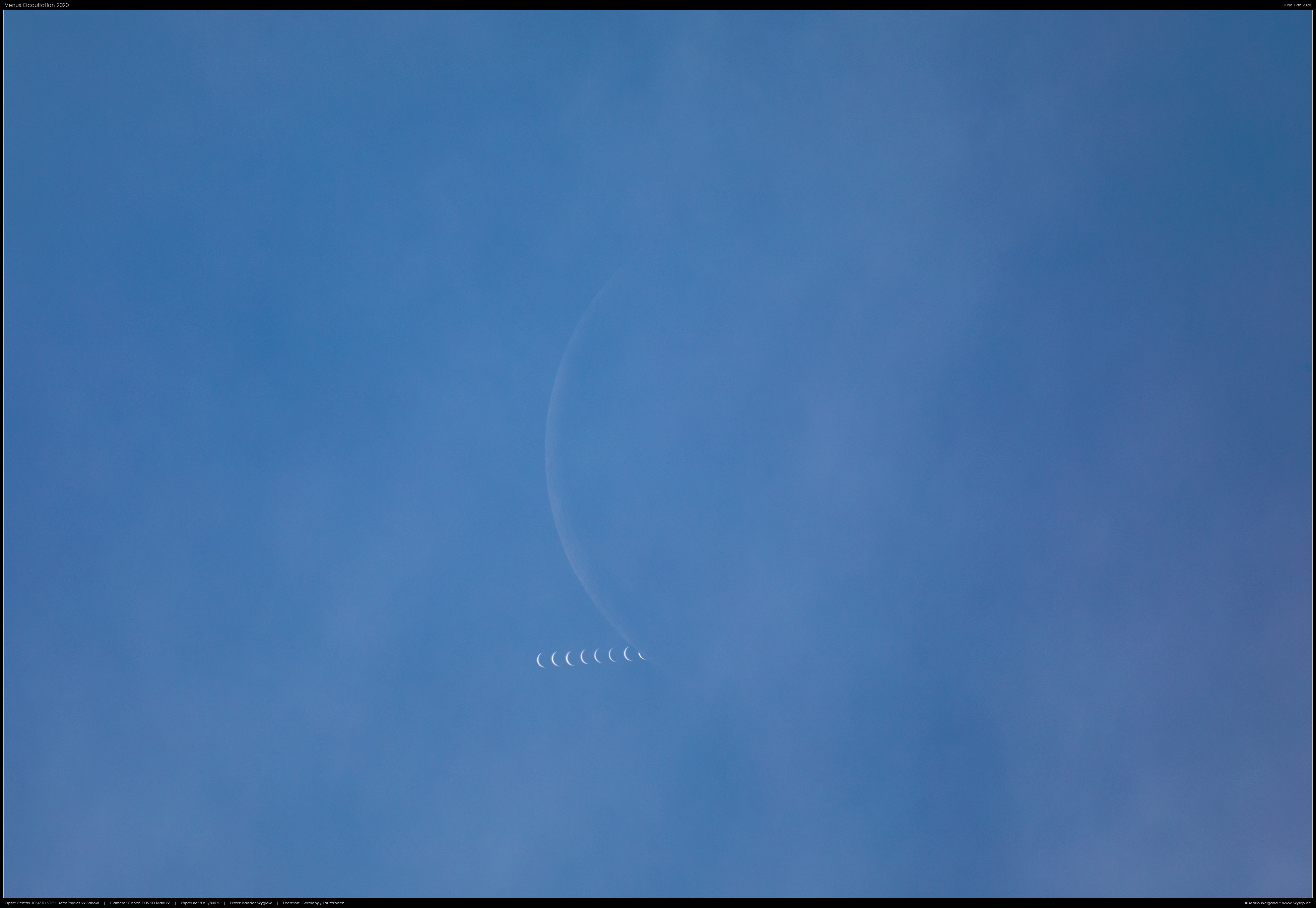 Ein Verlaufskomposit der Venusbedeckung 2020. Die Aufnahmen dafür entstanden am Pentax 105 SDP Astrograph mit Canon EOS 5D Mark IV und AstroPhysics 2x Barlow. Die Einzelbilder wurden in zwei Minuten Abstand je 1/800 Sekunden belichtet. Beim Austritt war die Venus zwar kurz noch durch den dichter werdenden Zirrus zu sehen, jedoch reichte es nicht mehr, um die Reihe entsprechend fortzusetzen. http://www.skytrip.de