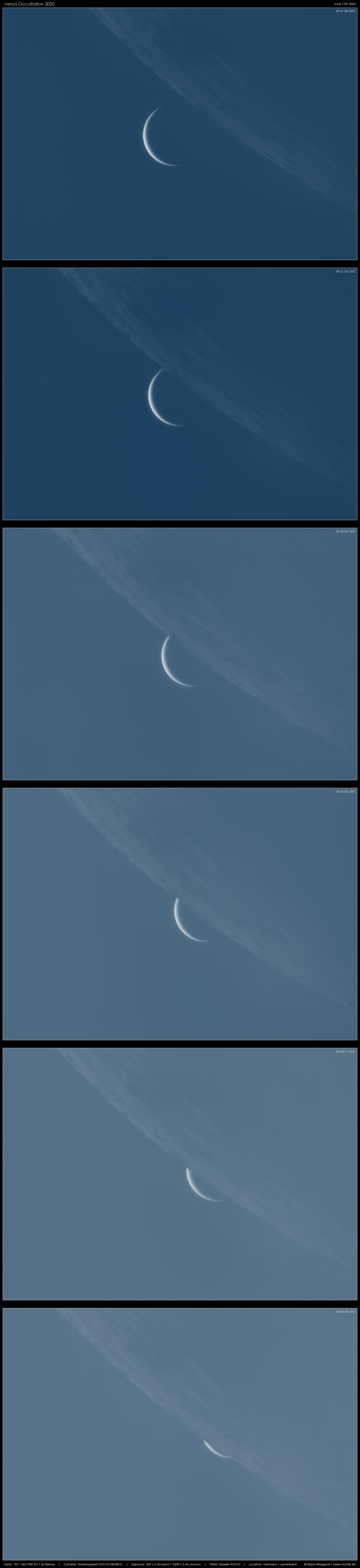 Die Venusbedeckung 2020 habe ich nicht nur mit dem Pentax-Astrographen und DSLR dokumentiert, sondern auch per Video am 6"-Apo mit höherem Detailgrad. Hier sind nun einige Resultate der Videoauswertung. Aufgrund der relativen Eigenbewegung von Mond und Venus war eine Unterteilung des Videos in kurze Abschnitte erforderlich. Letztendlich hat eine Segmentierung in acht Sekunden lange Abschnitte gut funktioniert und es standen jeweils 200 Frames für den Stack zur Verfügung. Das Seeing war konstant auf einem vernünftigen Niveau, sodass die Venussichel praktisch mit konstanter Qualität abgebildet wurde. Der Mond war grundsätzlich eine Herausforderung. Seine Flächenhelligkeit ist wesentlich geringer als die der Venus. Und nicht zuletzt war aufgrund der Zirrusbewölkung der Kontrast sehr bescheiden. Aus den 200 Frames ließ sich kein vernünftiges Bild des Mondes gewinnen. Dazu habe ich die Frames der 13 besten Abschnitte, in Summe also 2600 Frames, verwendet. Der im Laufer der Bildserie heller werdende Himmel hat seinen Ursprung in der dichter werdenden Zirrusbewölkung. http://www.skytrip.de