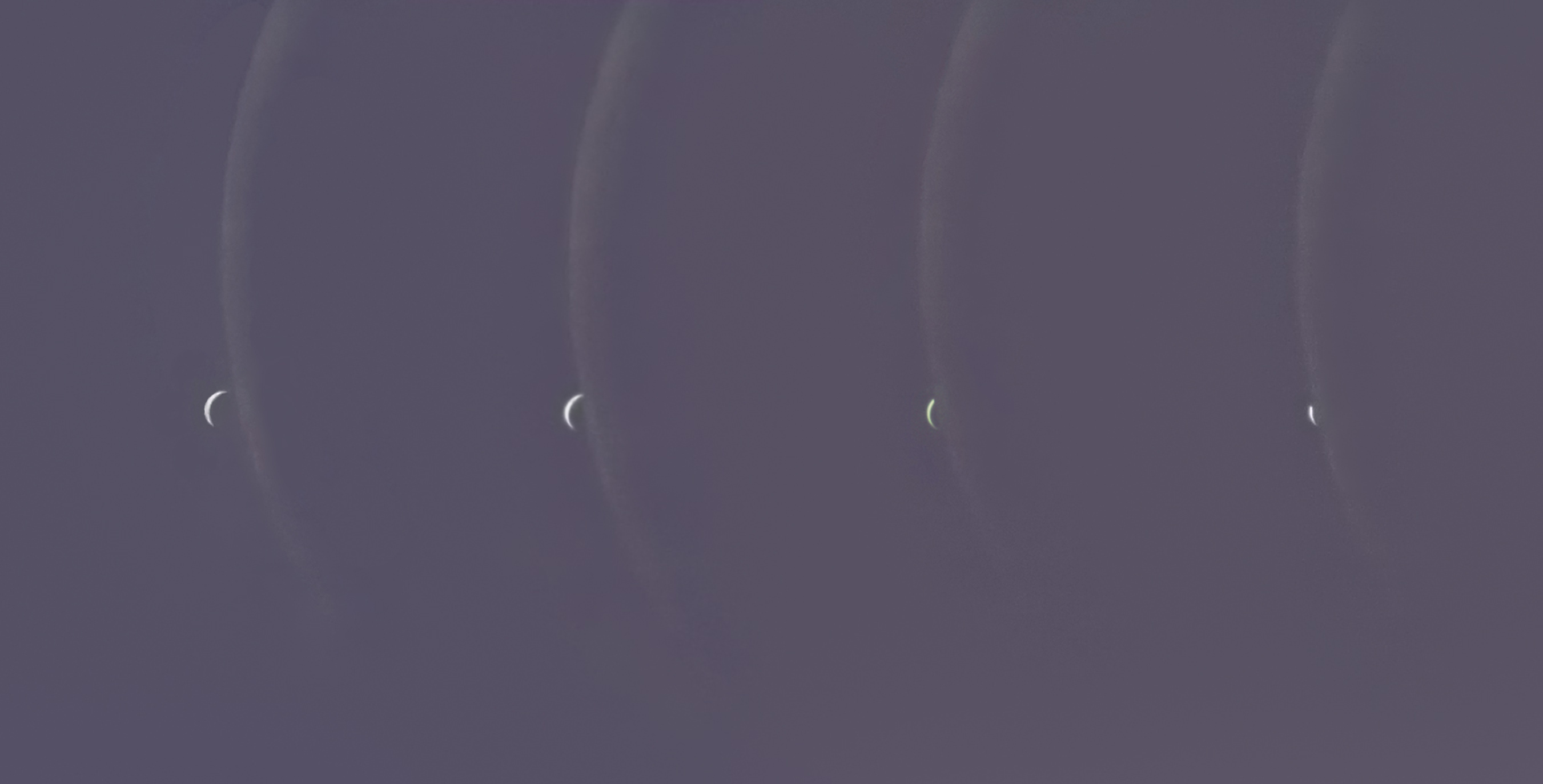Kurz vor dem ersten Kontakt der Venus mit dem Mond nahm die Bewölkung bei uns in Peine in Niedersachsen ab, so dass die Bedeckung hinter schwachen Schleierwolken beobachtet und aufgenommen werden konnte. Auf dem Komposit wurde der Hintergrund zum besseren Vergleich und zur Kontrasterhöhung etwas abgedunkelt.