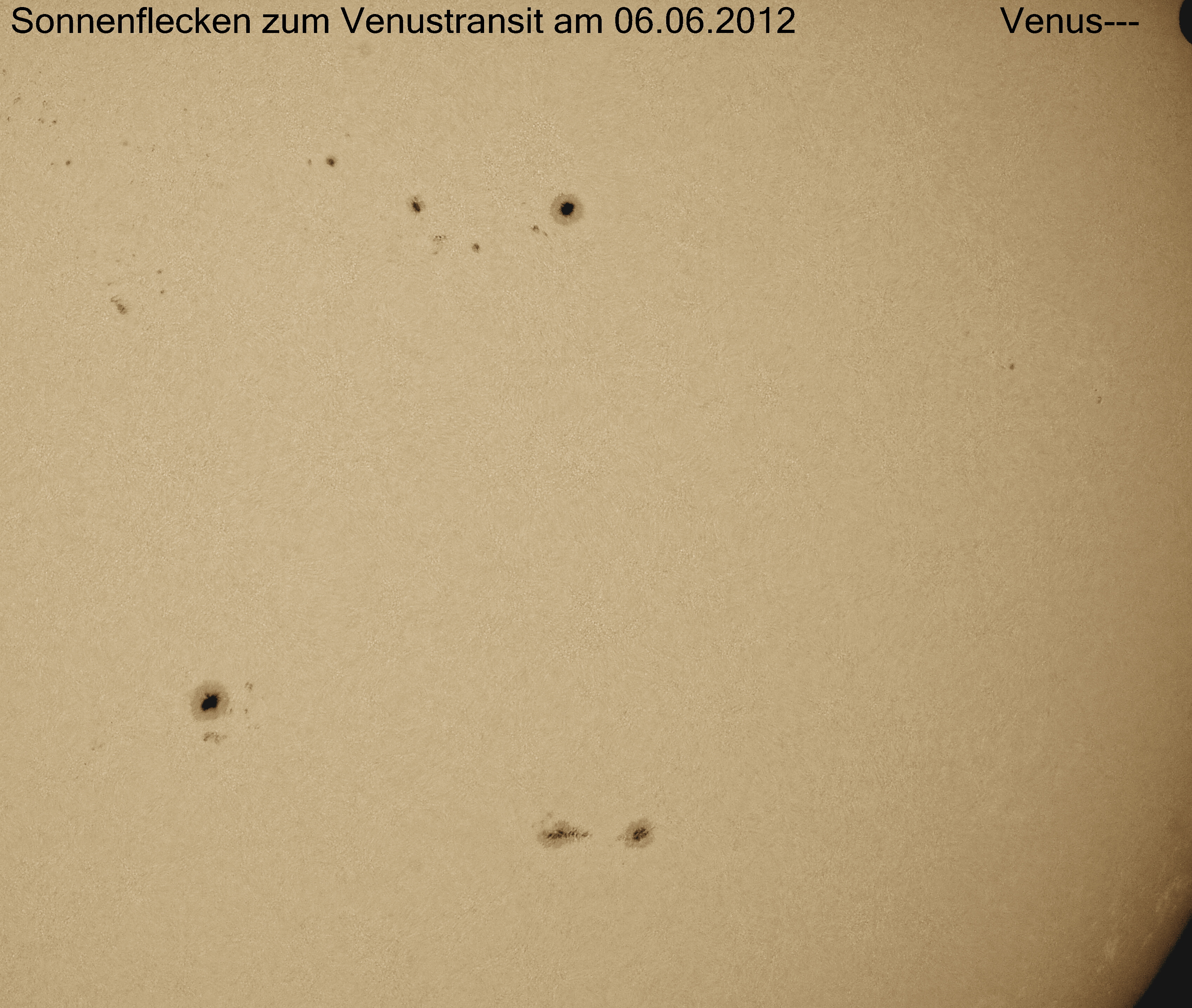 Zur Dokumentation eines Venustransites gehören natürlich auch die zu diesem Zeitpunkt zu sehenden Sonnenflecken.
