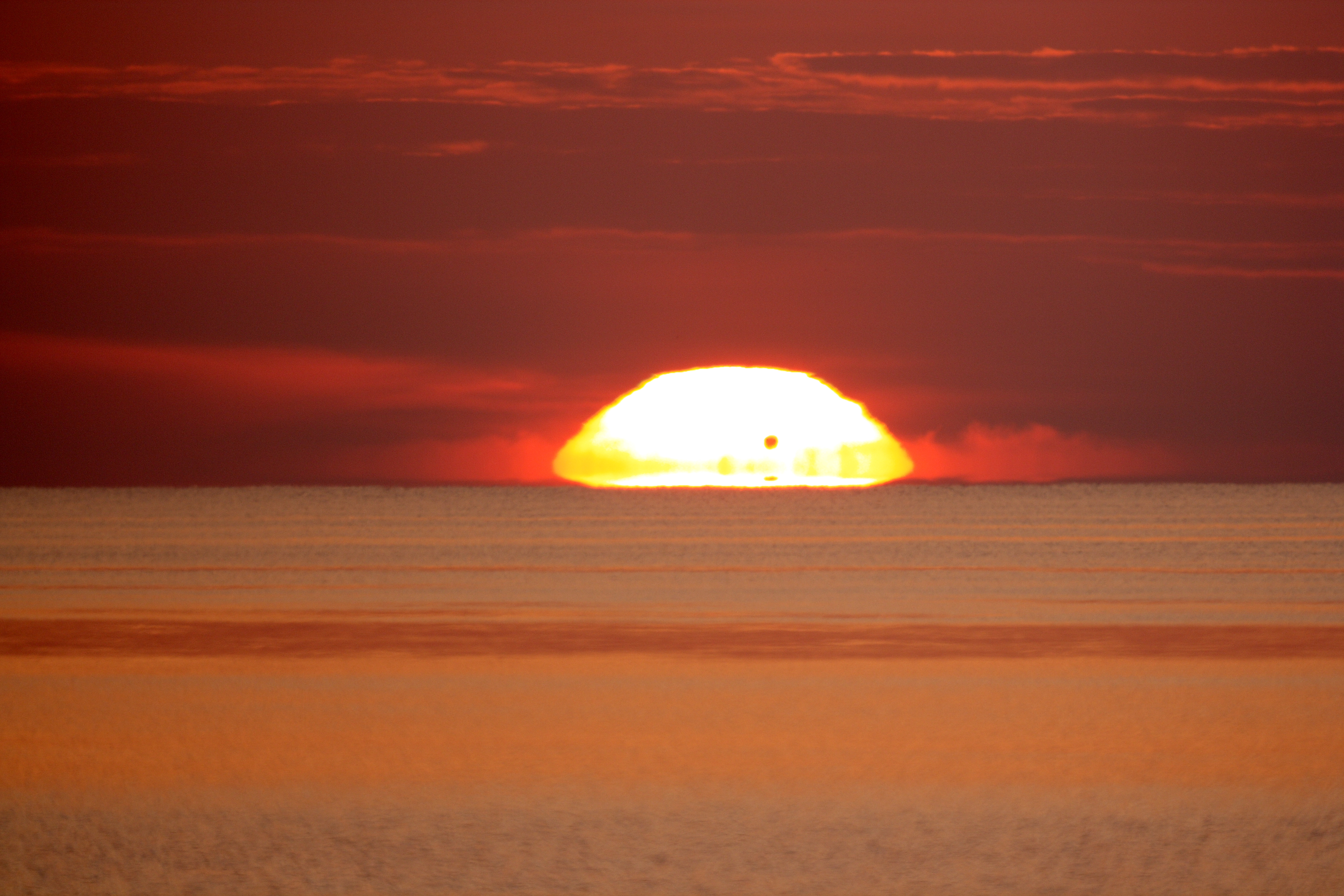 Die Aufnahme entstand am 6.6.2012 bei Sonnenaufgang über der ruhigen Ostsee in der Nähe von Dame. Es entstand eine ganze Reihe von Aufnahmen des Aufgangs, bei dem es zu zahlreichen atmosphärischen Effekten kam. Auf dieser Aufnahme ein besonders schönes Phänomen der sich im Transit befindlichen spiegelnden Venus.