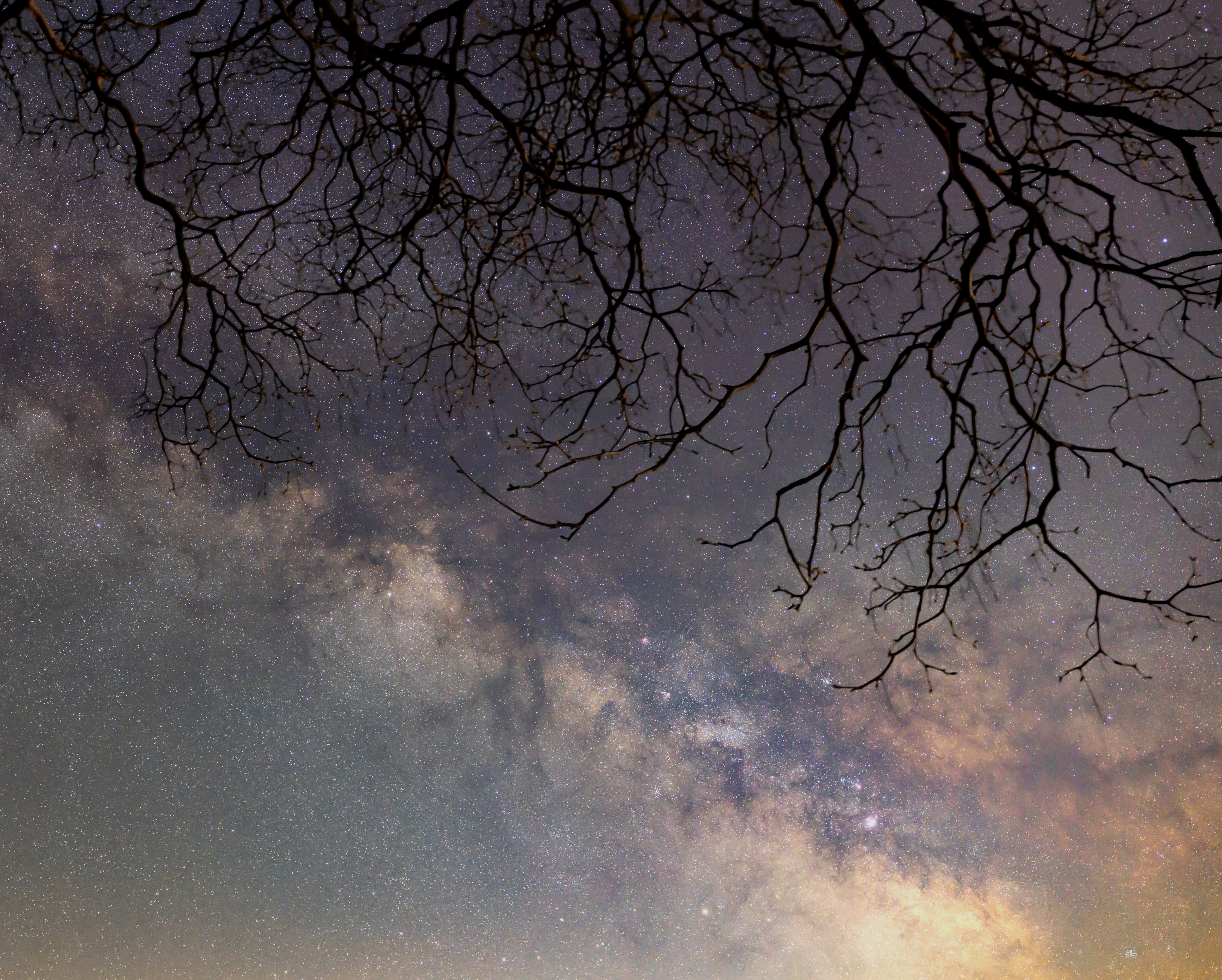 Nun im Frühling ist die Milchstraße schon ein auffälliges Objekt am Morgenhimmel. Der Baum im Vordergrund war hingegen noch im Wintermodus. Seine kahlen Äste bilden eine schöne Silhouette, die sich zudem noch in den verworrenen Staubbändern der Milchstraße fortzusetzen scheint.