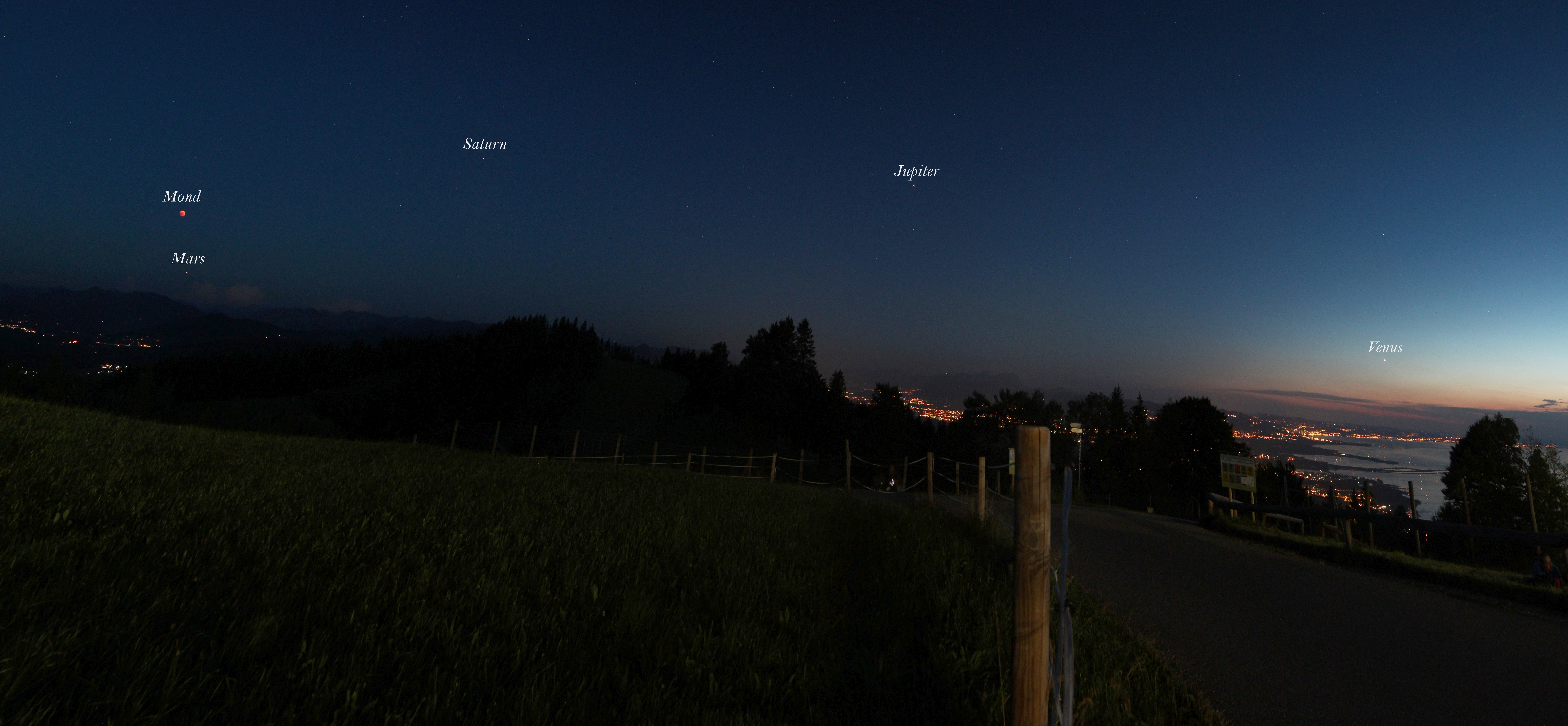 Ein lange geplantes Panorama mit dem verfinsterten Mond und den vier Planeten Venus, Jupiter, Saturn und Mars (sowie der Erde im Vordergrund) konnte ich von der Pfänder-Bergstation im österreichischen Vorarlberg aufnehmen. Das Bild besteht aus insgesamt acht Bildern, welche mit einem 14-mm-Objektiv aufgenommen wurden. Zum Glück hatte ich eine Ersatzspeicherkarte dabei, denn die vormittags neu gekauften SD-Karten verbrachten den Abend im Auto auf einem Parkplatz, einige Höhenmeter entfernt.