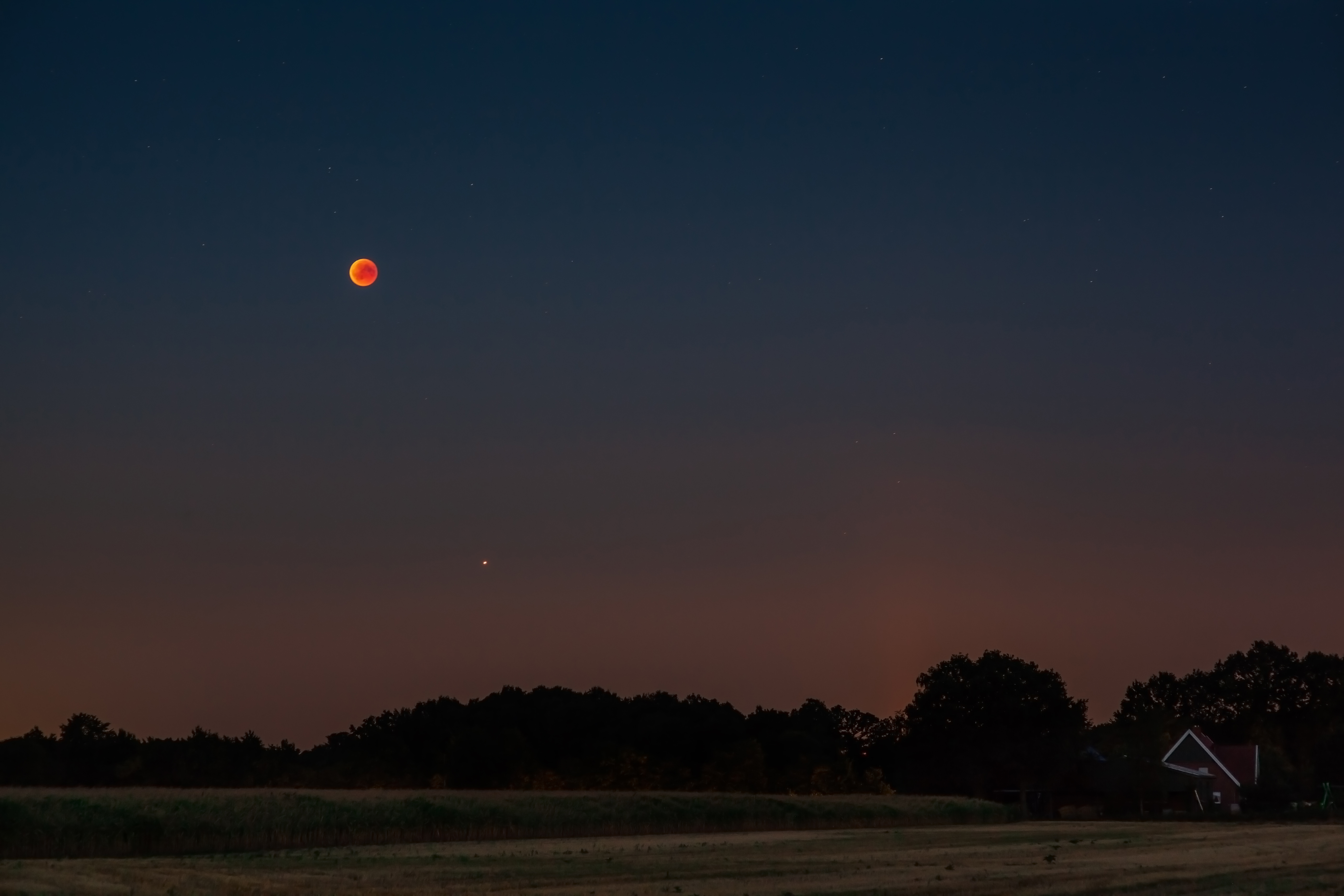 Der Mond während der totalen Verfinsterung zusammen mit dem Mars über dem MÜnsterland. Am Horizont erkennt man leider deutlich eine Aufhellung …