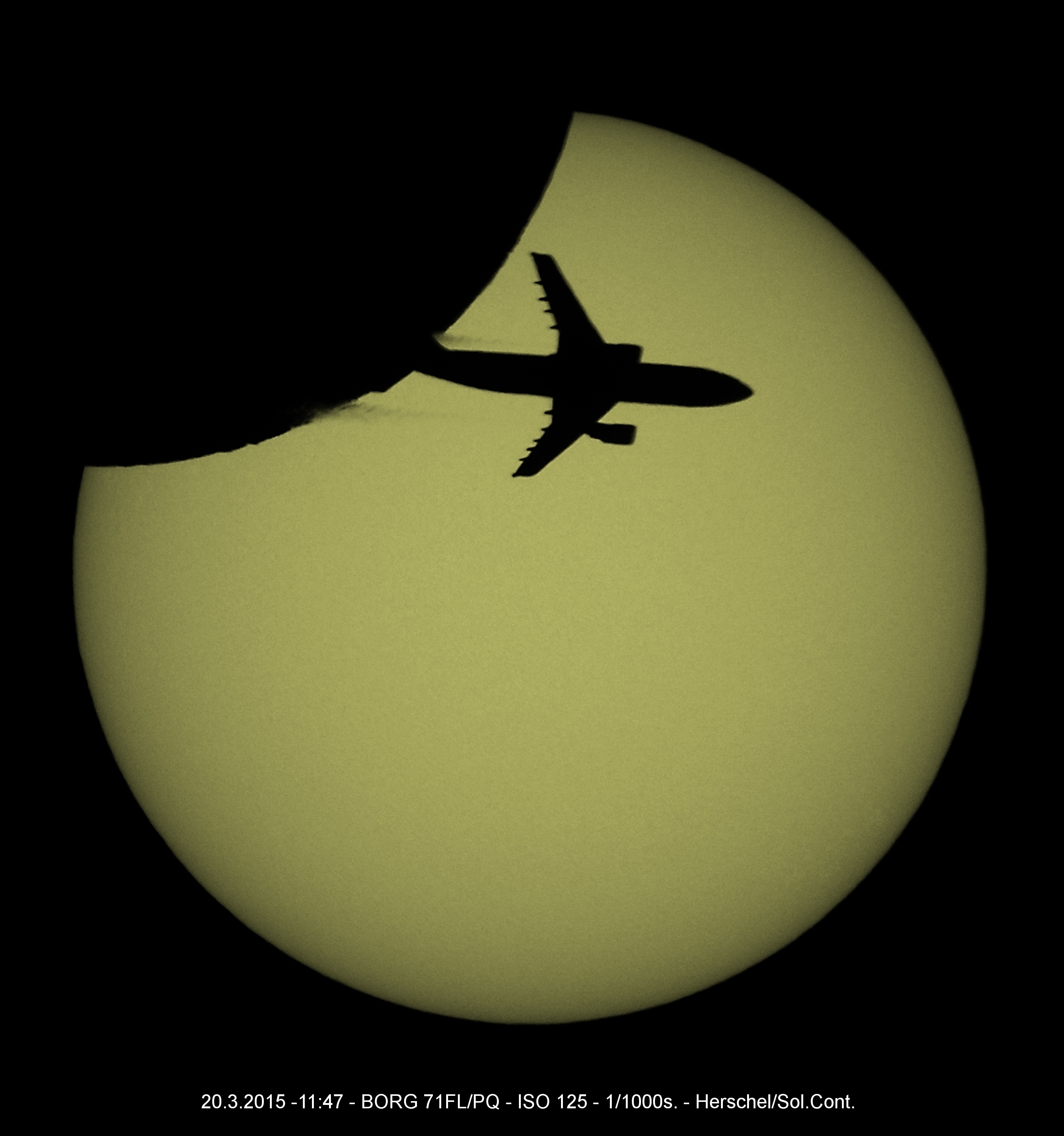 Glück muss man haben. Bei einer Aufnahme mit 2 Sekunden Zeitverzögerung fliegt ein Jet vor der verfinsterten Sonnenscheibe vorbei.