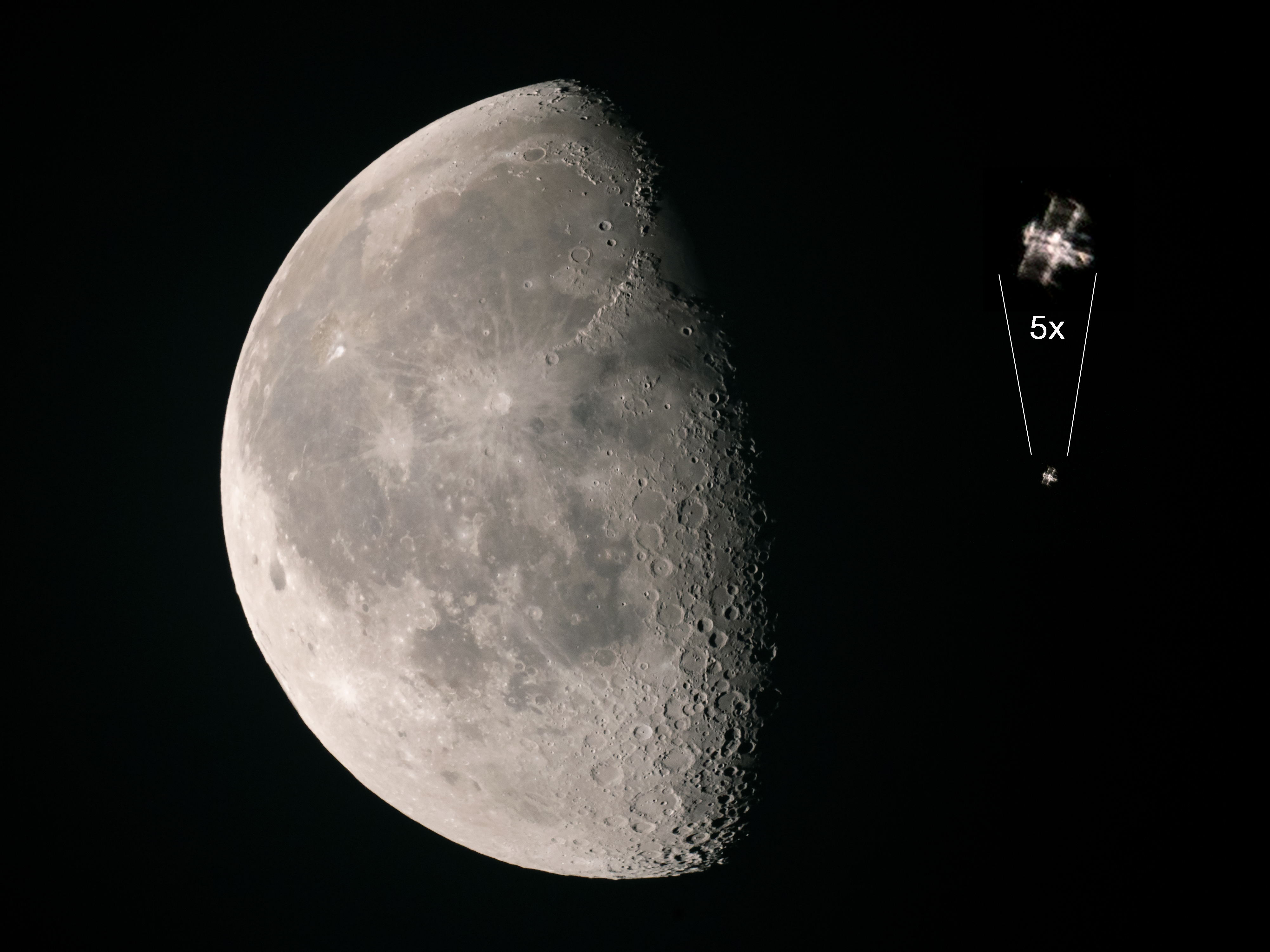 Am frühen Morgen des 27.1 Oktober 2021 zog die Internationale Raumstation etwa zwei Grad am Mond vorbei. Da beide relativ hoch und nebeneinander standen, eigneten sich die beiden Bilder für einen Vergleich. Dabei ist der Mond etwa tausendfach weiter entfernt als die ISS! Dadurch wird deutlich, weshalb wir keine Mondlandefähren auf dem Mond sehen können: sie sind einfach zu klein. Selbst die ISS wäre mit ihrem fussballfeldgroßen Abmessungen auf dem Mond nur ein Punkt!