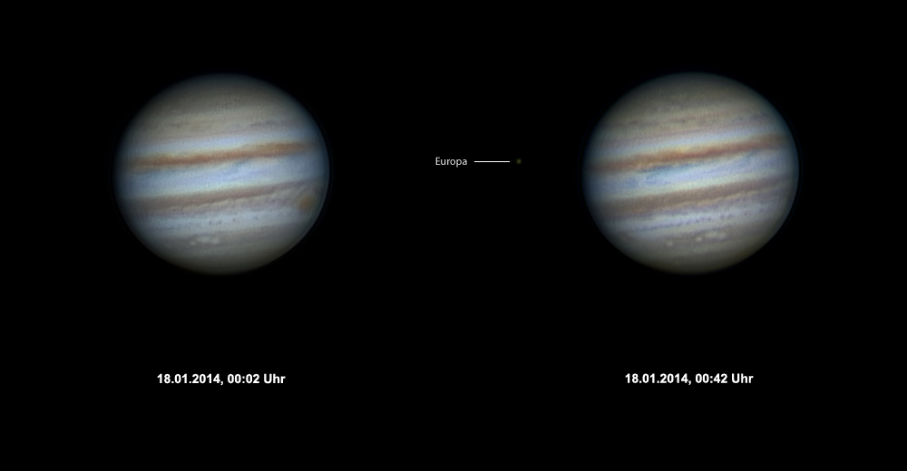 Bei dem ersten Bild befand sich Europa noch hinter der Planetenscheibe.