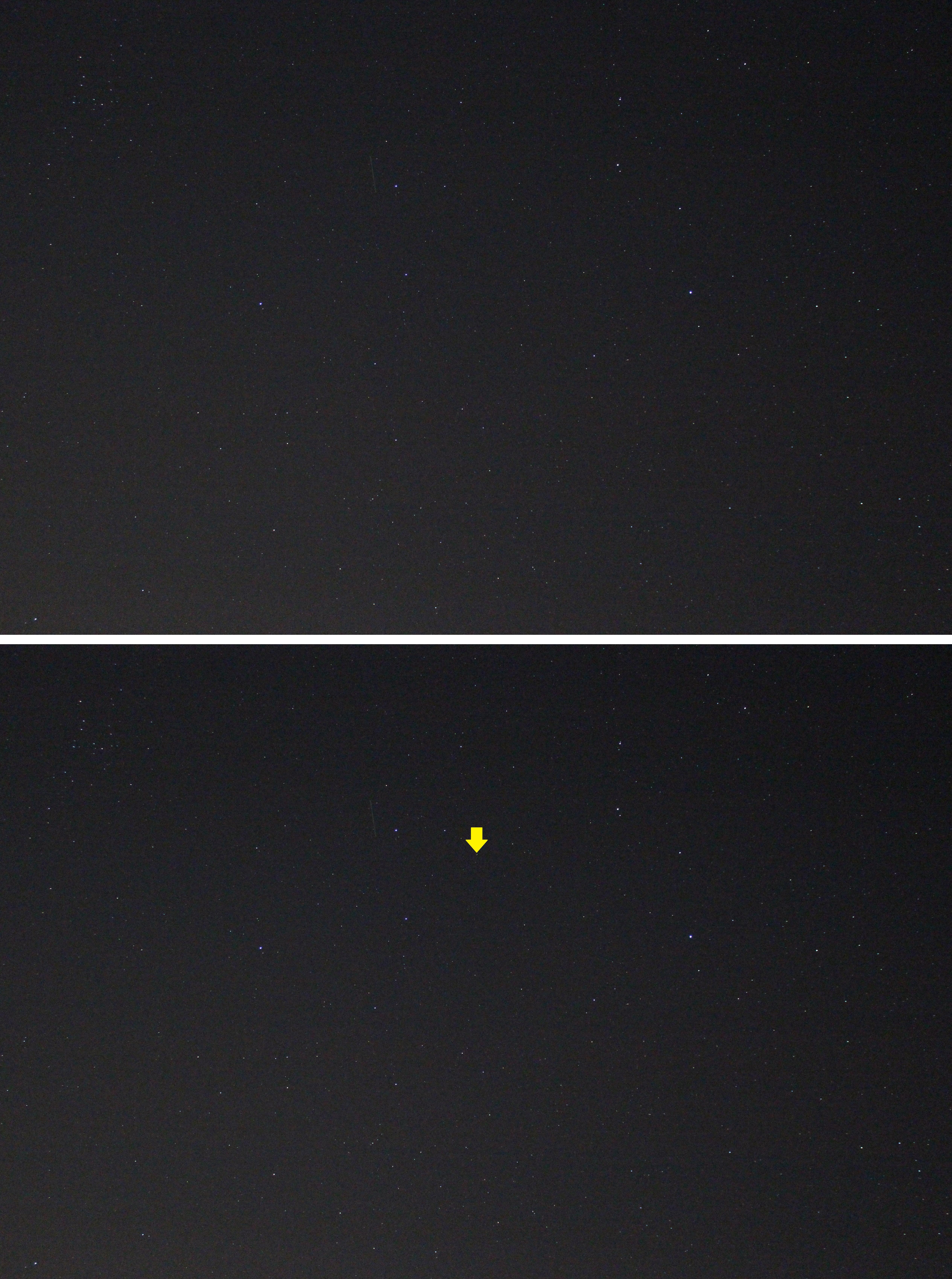 Sternbild Löwe mit Kleinplanet Vesta, aufgenommen am Abend des 31. März 2021. Auf dem unteren Bild, das zur gleichen Zeit mit dem gleichen Belichtungsparametern wie das obere Bild aufgenommen wurde und das auch den gleichen Himmelsausschnitt zeigt, ist der Kleinplanet Vesta mit einem gelben Pfeil markiert.