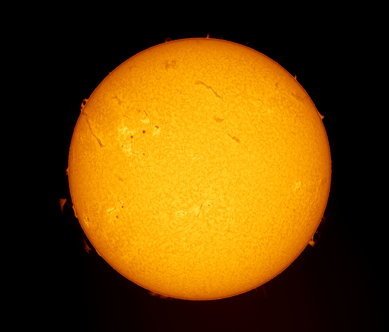 Am Nachmittag des 23. November 2023 waren die Bedingungen endlich gut, und ich konnte die neue Kamera ausgiebig testen. Sehr schön ist die aktive Chromosphäre zu sehen mit den Aktivitätsregionen und den Filamenten. Auch sehr gelungen sind die Protuberanzen am Sonnenrand. Wirklich schön zu sehen was mit einem 50-mm-Frontetalon von Lunt sichtbar wird!