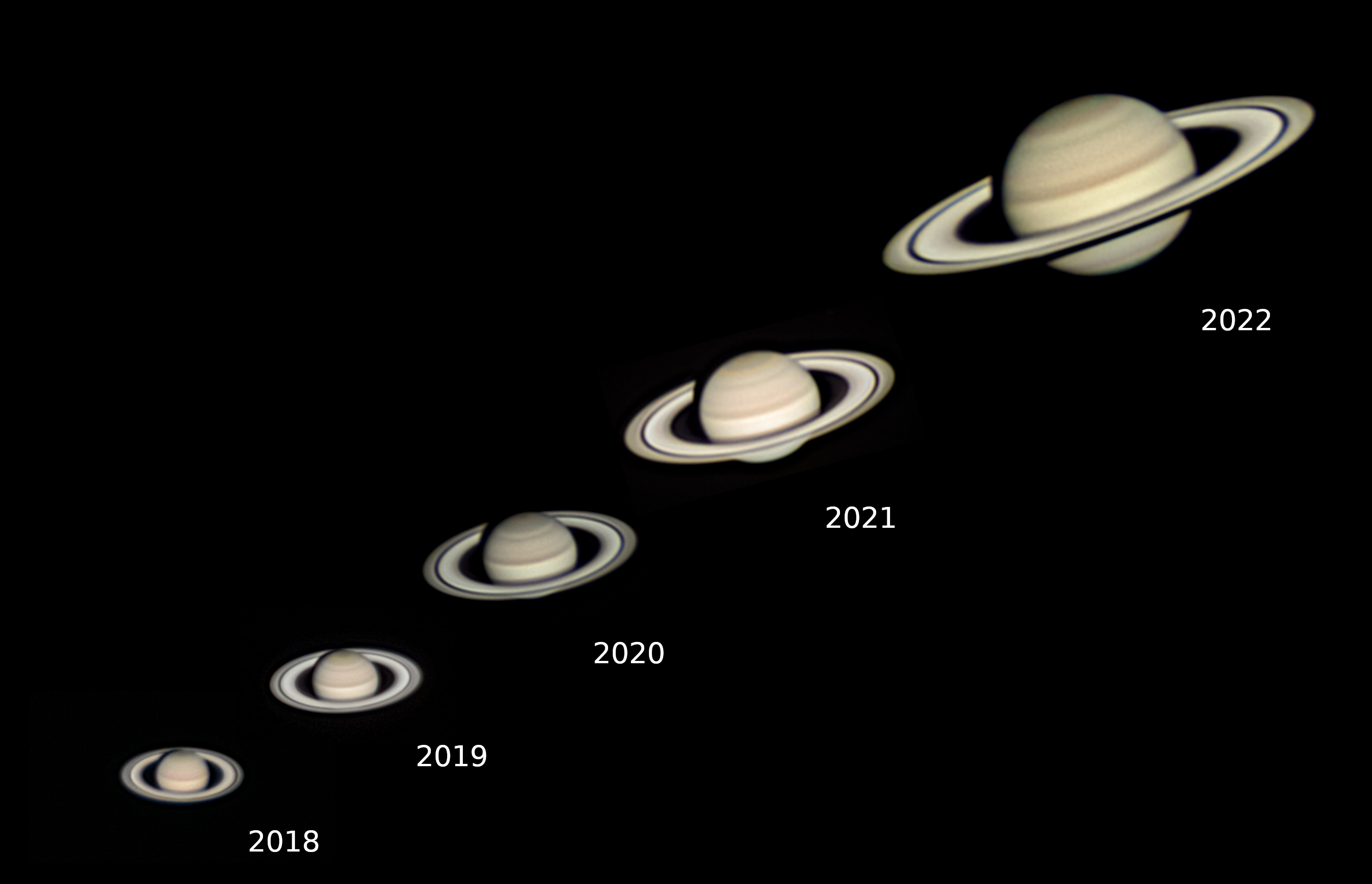 Saturns Entwicklung in den letzten vier Jahren. Die 4500 Kilometer breite Cassini-Teilung ist sehr gut zu sehen.