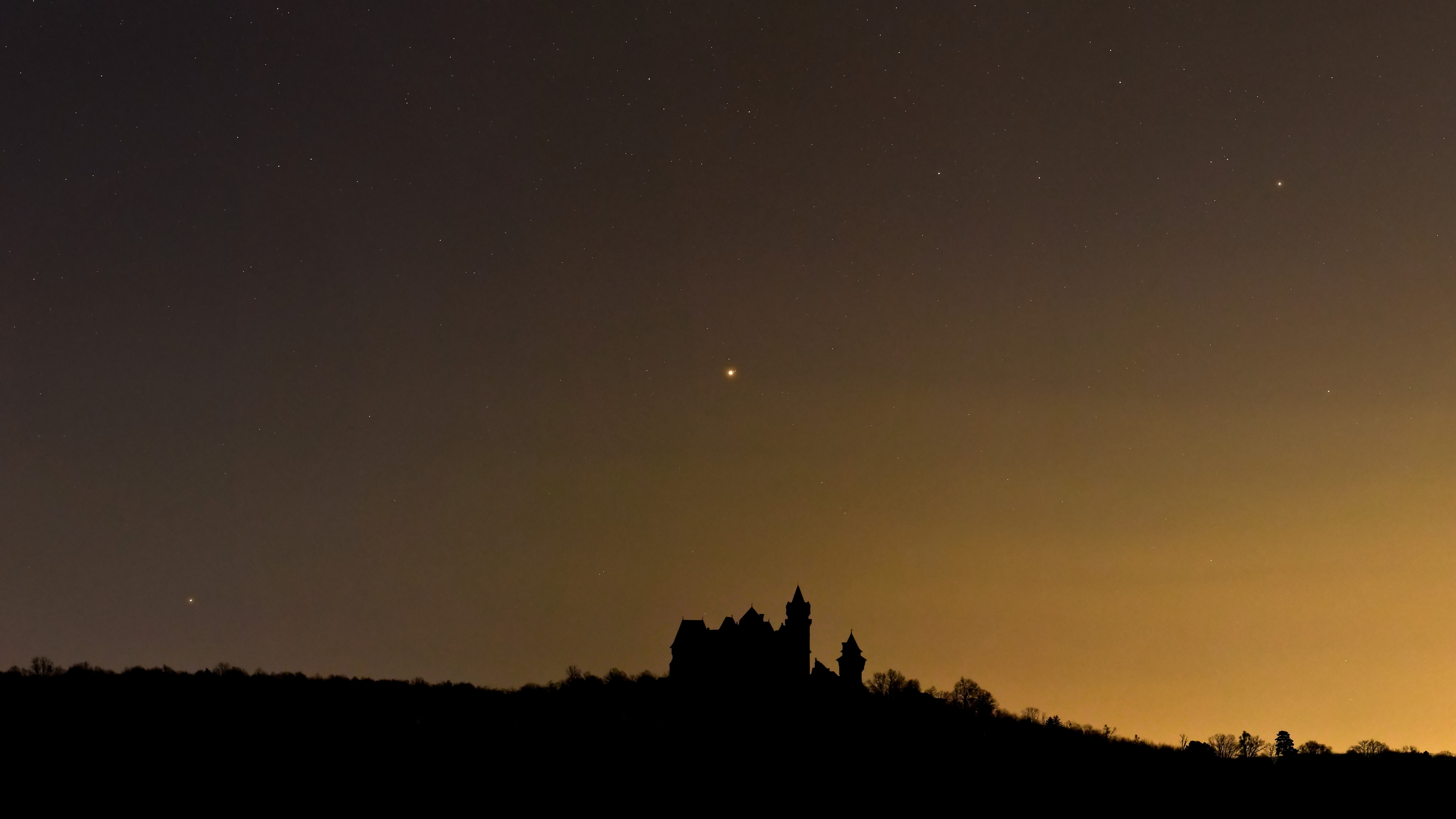 Das halbe Sonnensystem in einer Aufnahme vereint! Von links: Saturn, Jupiter und Mars. Als malerisches Vordergrundobjekt diente hier die Silhouette der Burg Kreuzenstein bei Korneuburg (NÖ), Planet Erde.