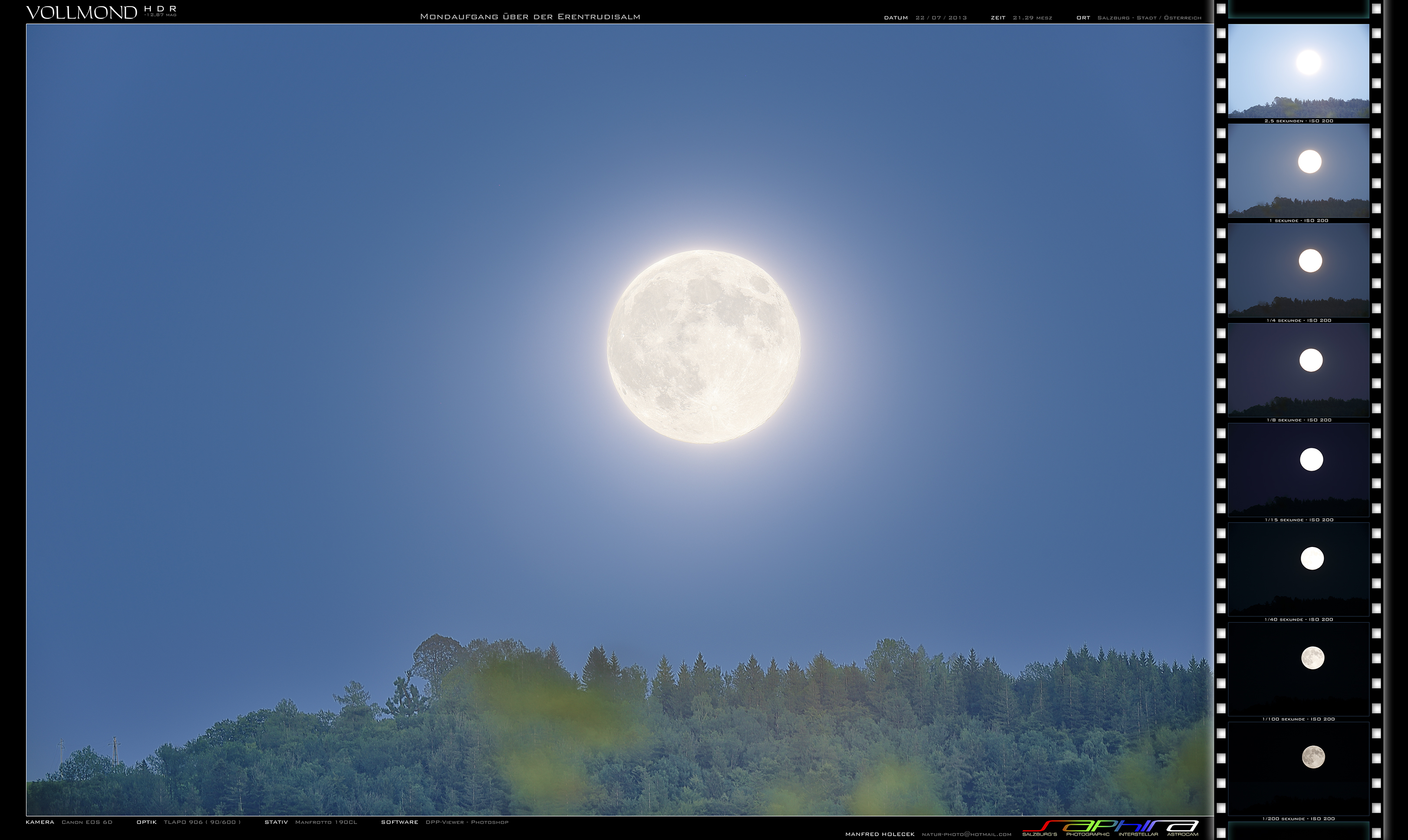 Nach langer Wartezeit ist es mir nun endlich gelungen, ein Bild des aufgehenden Vollmonds mit erheblich gesteigertem Dynamikumfang zu erstellen. Das Wetter hätte am 22. Juli 2013 nicht besser sein können, und so legte ich mich am Küchenfenster rechtzeitig auf die Lauer.