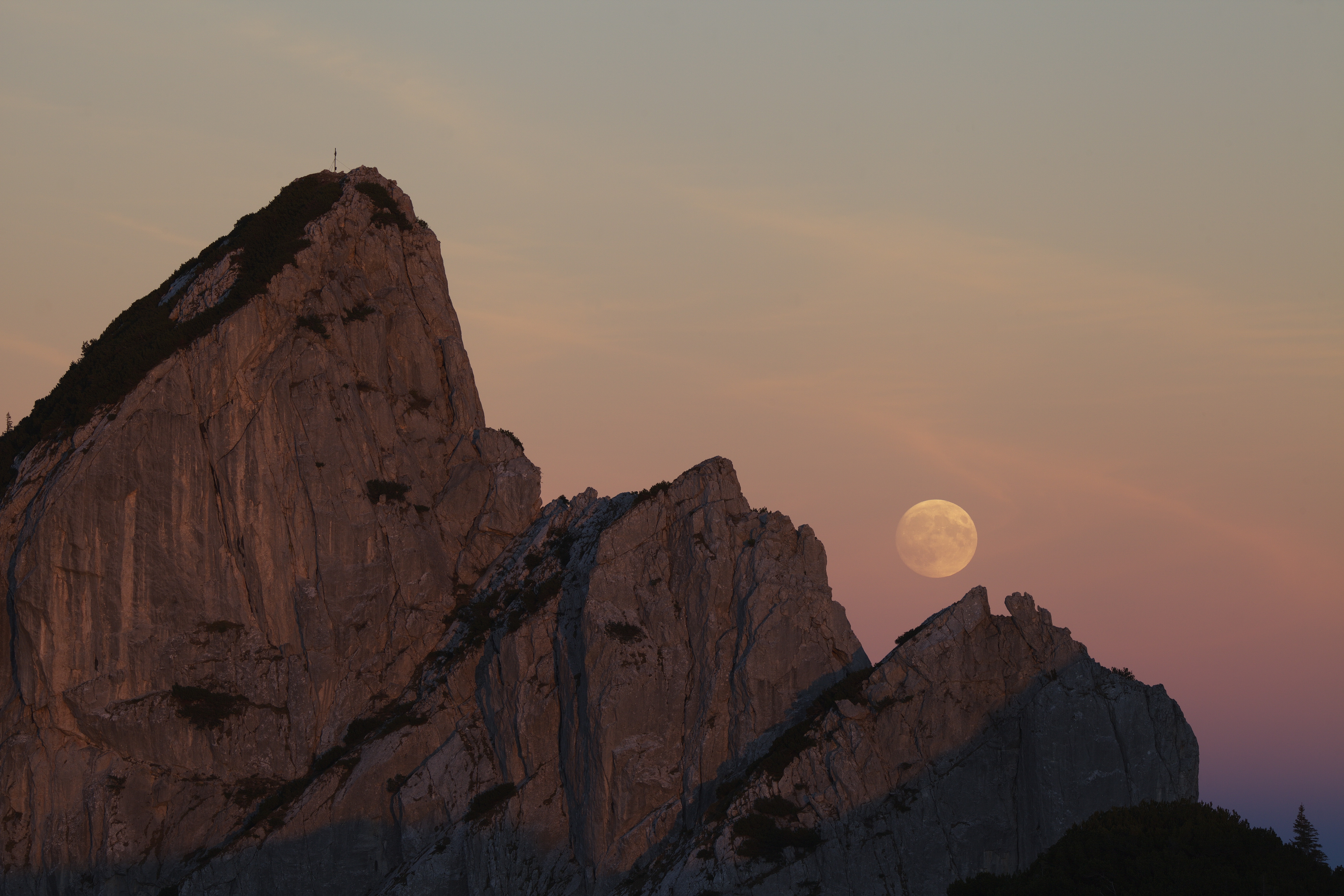 Das Bild zeigt die Felsformation der Ruchenköpfe im bayerischen Mangfallgebirge. Ich hoffte, den aufgehenden Vollmond über den Felsen mit dem letzten Sonnenlicht fotografieren zu können. Und tatsächlich stieg er wie bestellt in den Himmel.