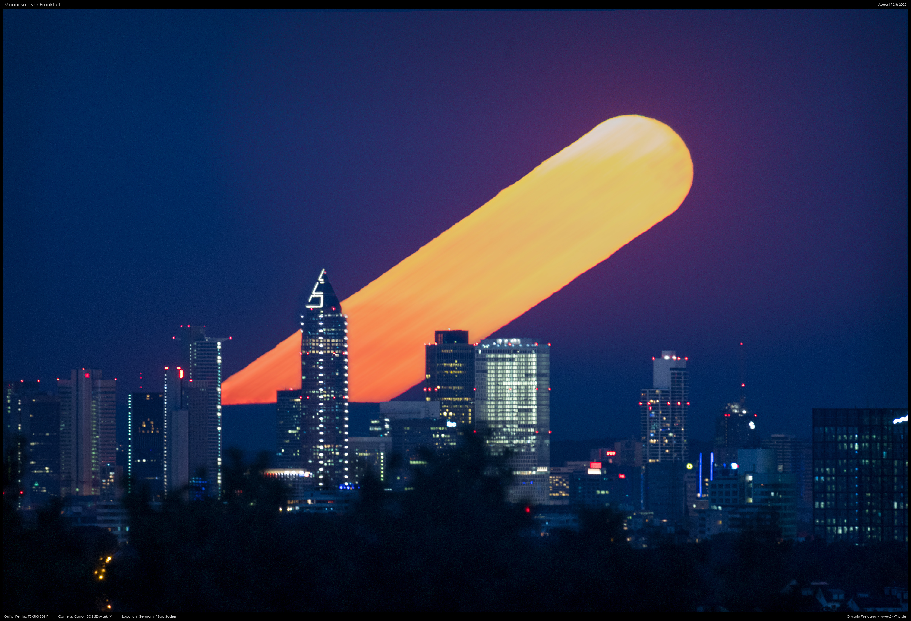 Am 12. August ging der Vollmond von Bad Soden aus gesehen genau hinter der Skyline Frankfurts auf und bot in der späten Dämmerung einen tollen Anblick. http://www.skytrip.de