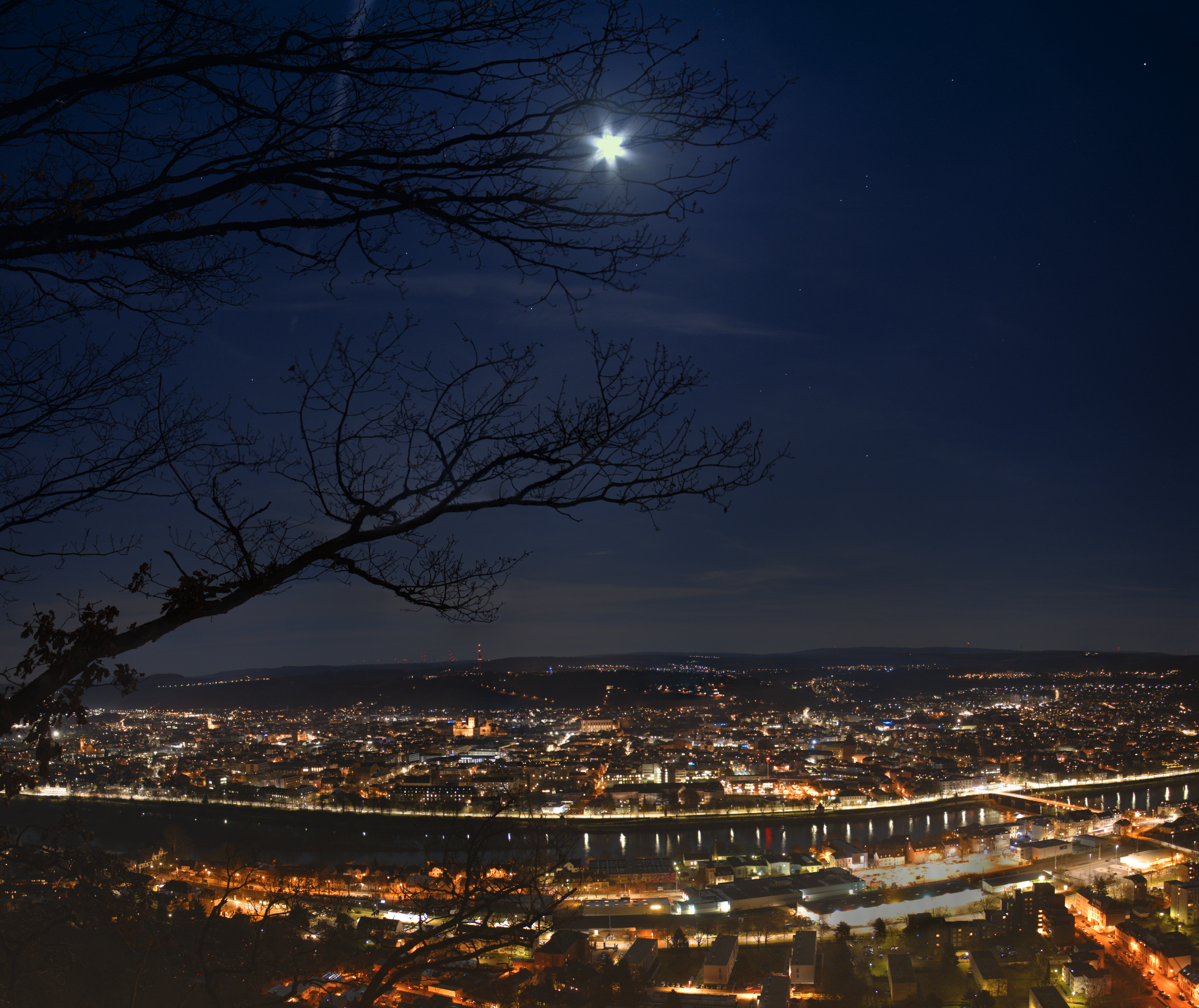 Diese Aufnahme entstand in der Vollmondnacht vom 19. Februar 2019. Der Blick geht vom Markusberg Richtung Osten in das Moseltal mit der Stadt Trier und ihren historischen Wahrzeichen wie der Römerbrücke über die Mosel, der Konstantinsbasilika, dem Dom St. Peter und der Porta Nigra.