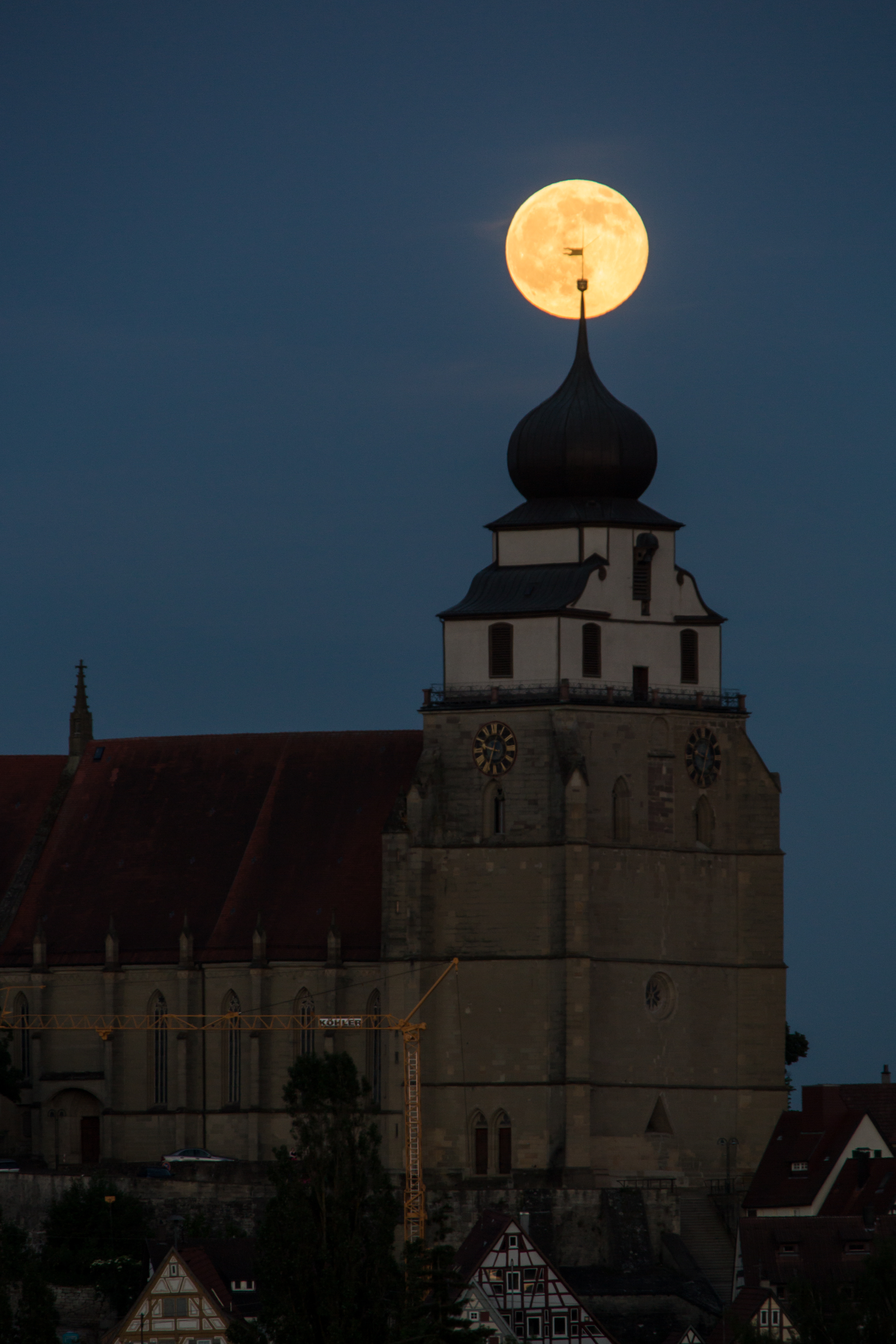Zum Vollmondaufgang am 2. Juni 2015 hatte ich mir vorgenommen den Mond über meinem Wohnort Herrenberg zu zeigen. Die Stiftskirche thront dort auf halber Höhe am Schloßberg über der Stadt. Aufgrund ihrer massiven Ausführung und der Lage wird sie auch die "Glucke vom Gäu" genannt.