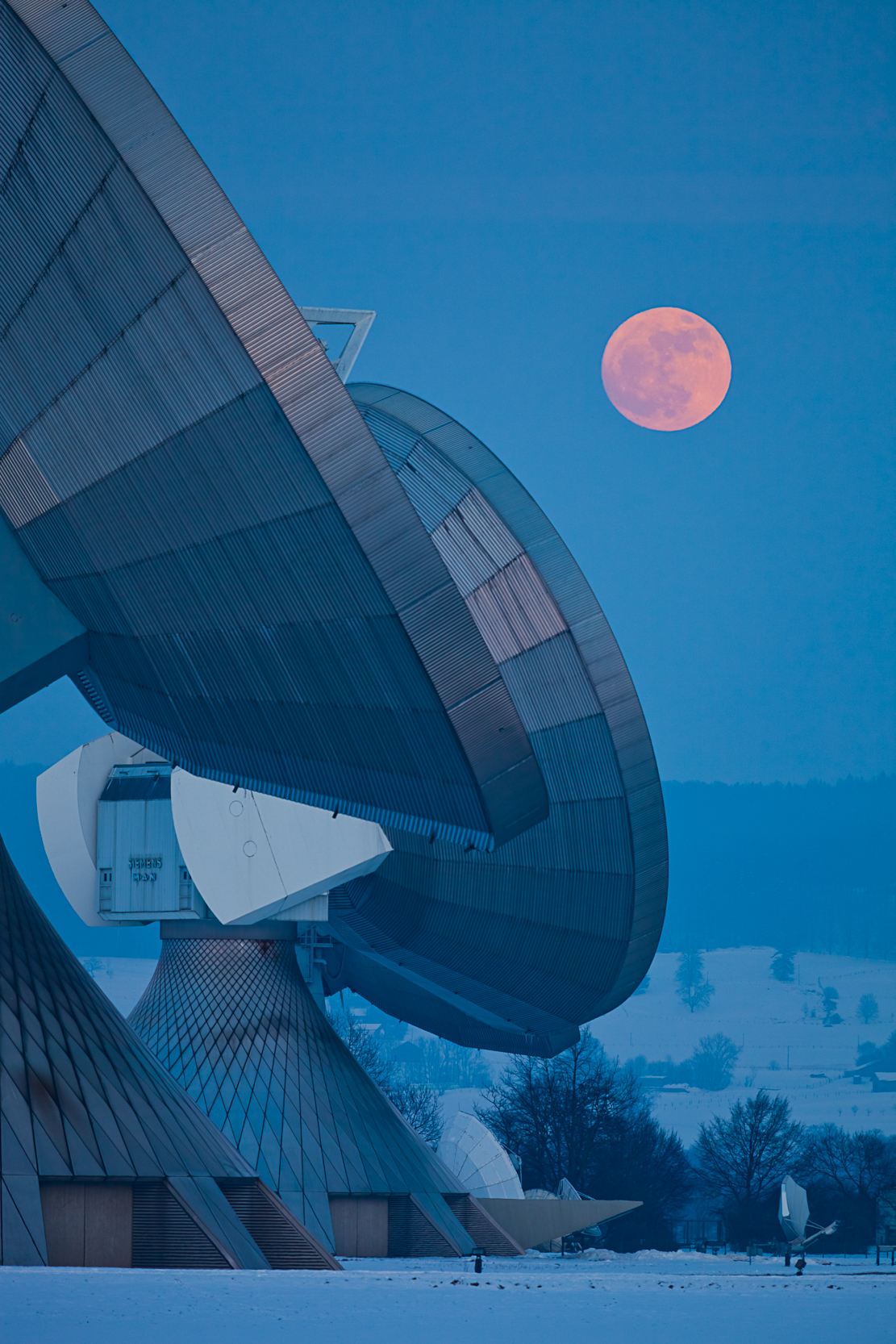 Bei recht frischen Temperaturen von -12 Grad Celsius erhob sich der Vollmond am 26. Januar 2013 langsam aus dem Bodendunst über die Antennen der Erdfunkstelle Raisting.