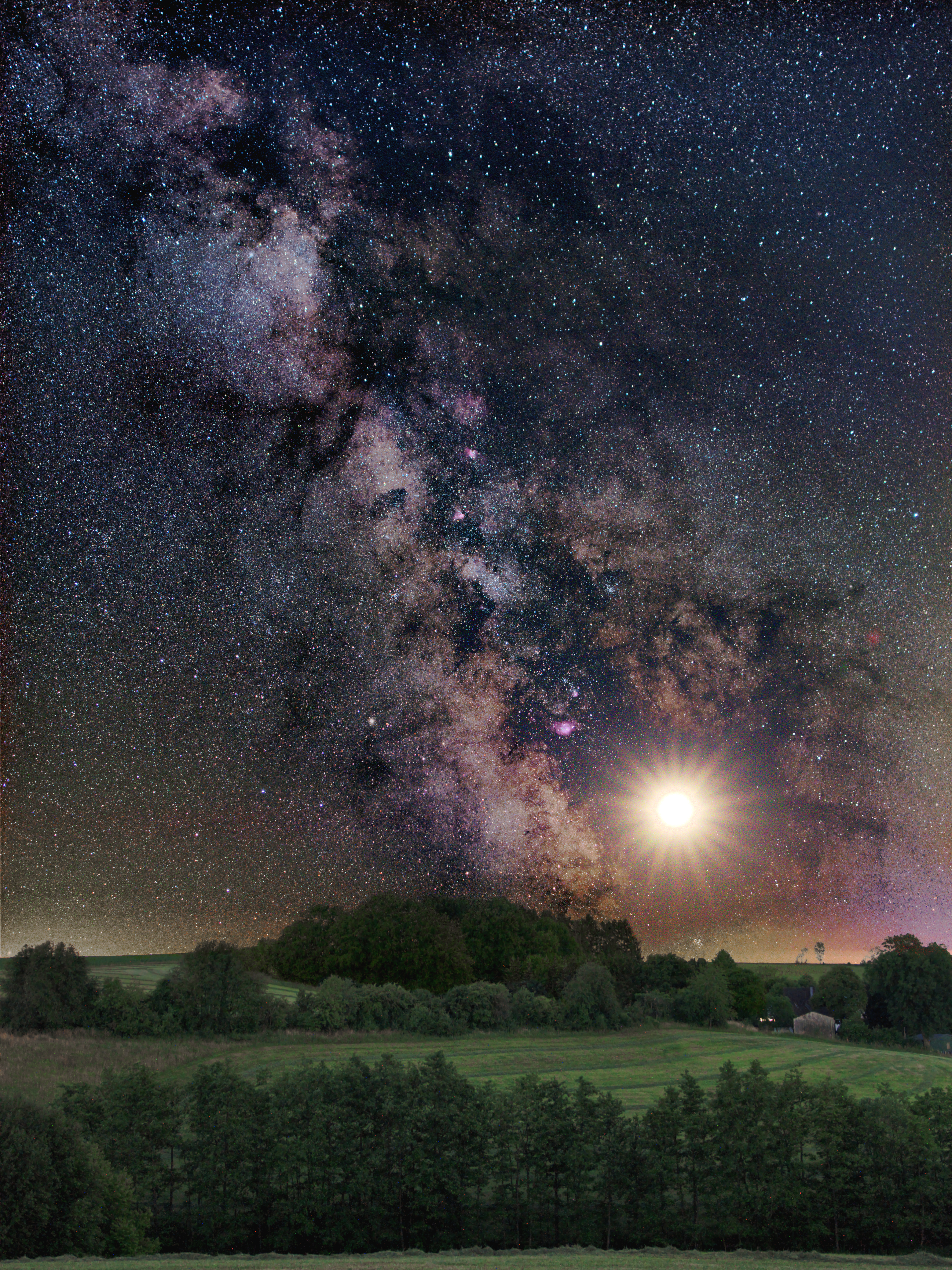 Es scheint so als würde das gleißend helle Mondlicht die Dunkelwolken unseres Zentrums der Milchstraße erhellen. Was dem bloßem Auge verborgen blieb, das kann die Astrofotografie sichtbar machen, als der noch fast volle Mond in der Nacht vom 4. auf den 5. Juni um 2:17 MESZ tief im Süden vor der Milchstraße steht. Im Vordergrund erheben sich die letzten Hügel des Sauerlandes hinein ins Bergische Land. Damit Landschaft, Mondlicht und die Milchstraße gemeinsam auf das Bild kommen, bedurfte es am selben Standort zwei Aufnahmesequenzen an zwei Aufnahmetagen, in diesem und letzten Jahr - einmal mit - einmal ohne Mond.