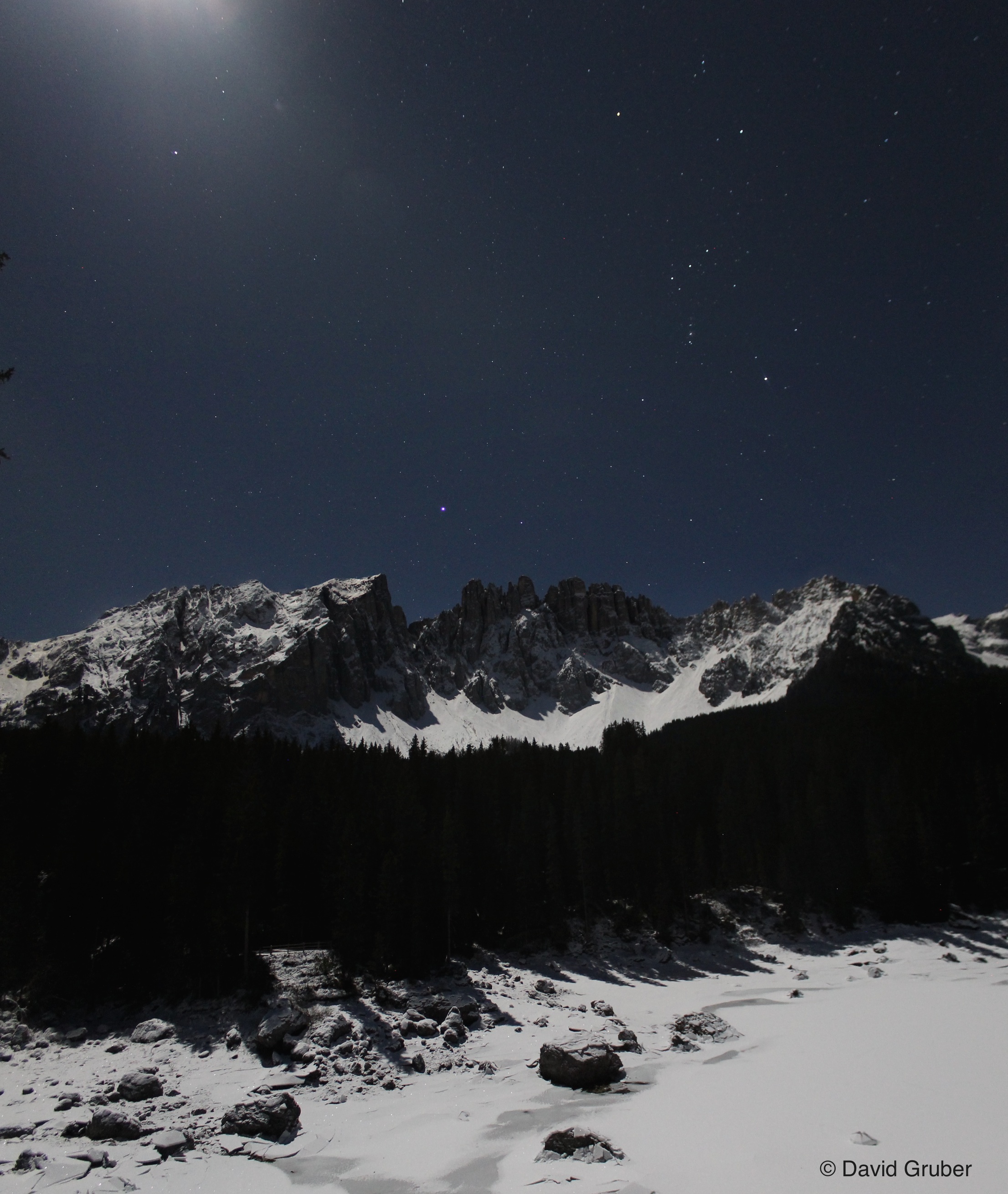 In der ersten Vollmondnacht des Jahres habe ich den Karersee, das Latemarmassiv und den Sternenhintergrund fotografiert. Sogar Komet Lovejoy ist rechts vom Himmelsjäger Orion auszumachen.
