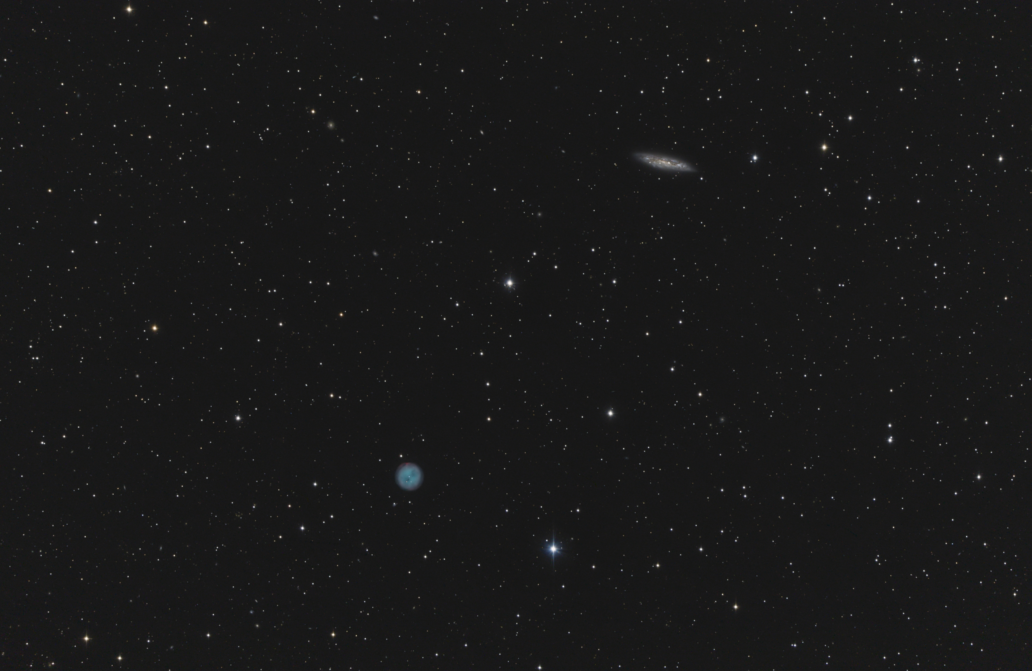 Die Widefield-Aufnahme mit M 97 und M 108 enthält Objekte über einen riesigen Entferungsbereich, von relativ nahen Sternen in 50 Lichtjahren Entfernung über Millionen Lichtjahre entfernten Galaxien bis hin zu einem Quasar in einer Distanz von 8 Milliarden Lichtjahren.