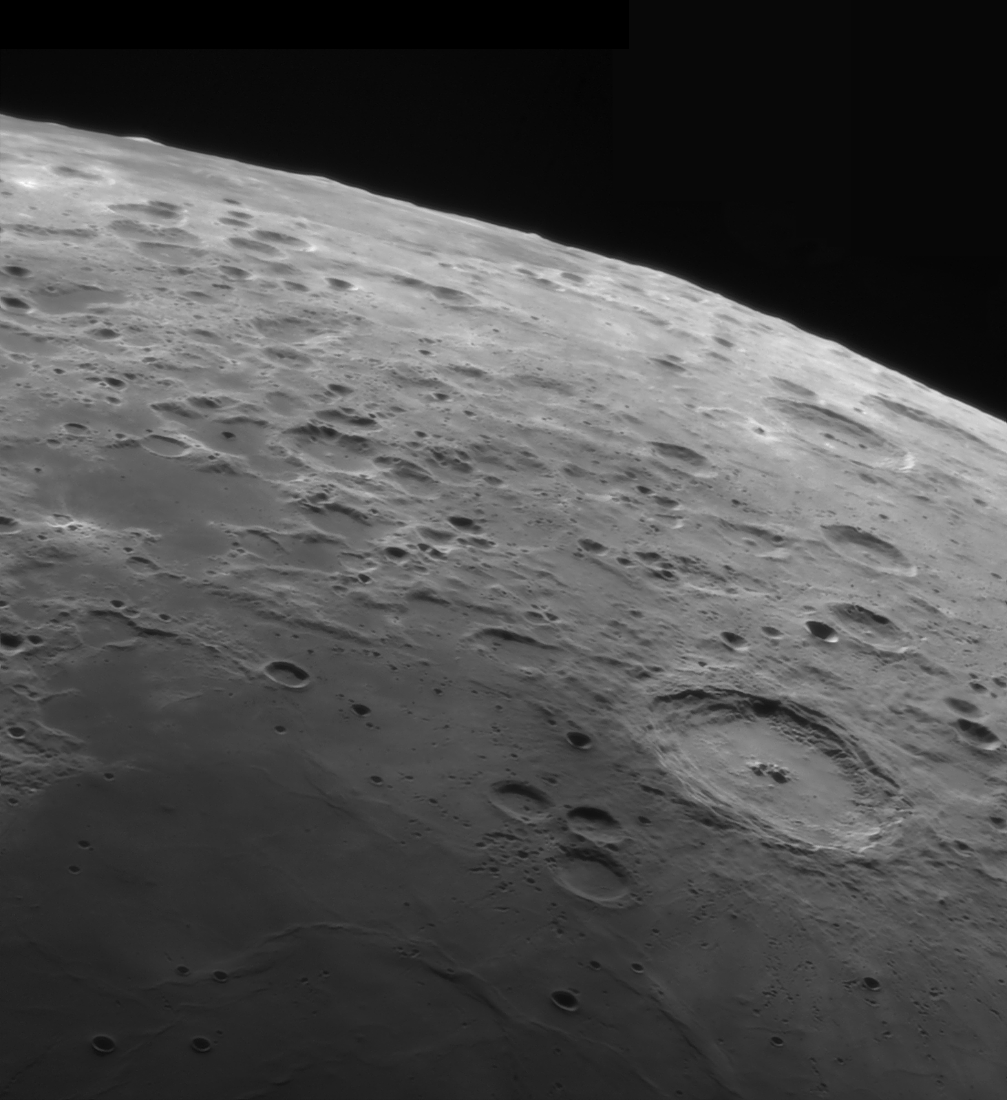 Der Infrarot-Bandpassfilter half mir, dieses Bild noch weit vor Sonnenuntergang aufzunehmen, als der Mond noch hoch am Himmel stand. Bei der Bildverarbeitung war eine heftige Kontrasterhöhung notwendig. Das Mondalter von knapp 3,5 Tagen rückte den östlichen Rand des Montes ins rechte Licht, um dort noch Details erkennen zu können. Mit einer Drehung des Bildes um 90 Grad gegen den Uhrzeigersinn ergibt sich eine deutlich bessere Wahrnehmung der bewegten Mondtopografie.