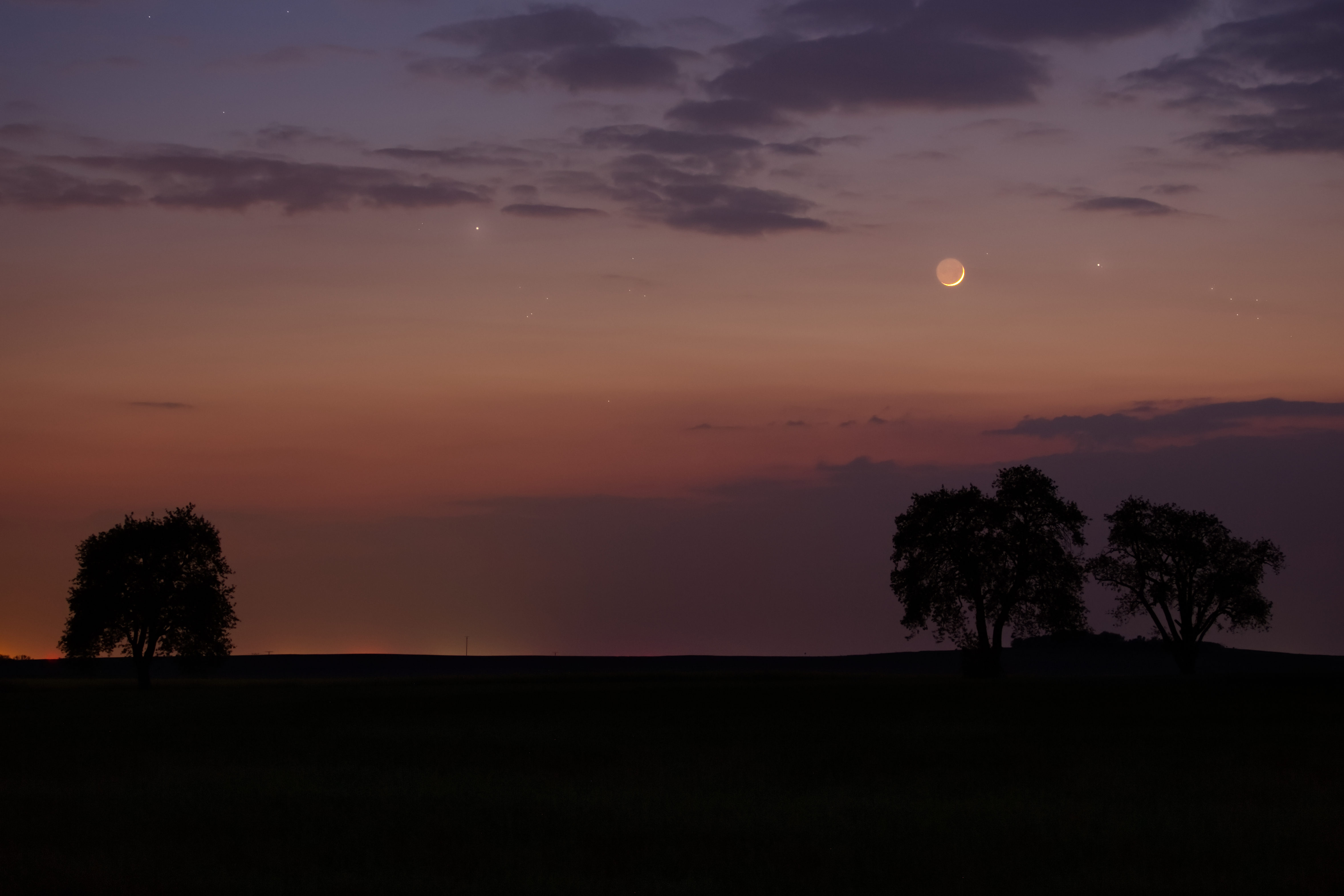 Merkurs Abendsichtbarkeit geht in diesen Tagen zu ende. Zuletzt konnte man sehr schön mitverfolgen, wie der Götterbote nur ein Grad südöstlich am offenen Sternhaufen der Plejaden vorbeizog. Am Tag dieser Aufnahme, dem Abend des 2. Mai 2022, gesellte sich die 1,8 Tage alte Mondsichel hinzu. Sie wanderte weitere 2,5 Grad südöstlich an Merkur vorbei. Zudem ist Aldebaran, der Hauptstern des Sternbildes Stier und auch einige Mitglieder des offenen Sternhaufens der Hyaden zu erkennen. Die Plejaden, Merkur, der Mond und Aldebaran bilden dabei eine nahezu horizontale Linie. Die Aufnahme entstand über einer Landschaft im Saargau nahe der Gemeinde Körrig.
