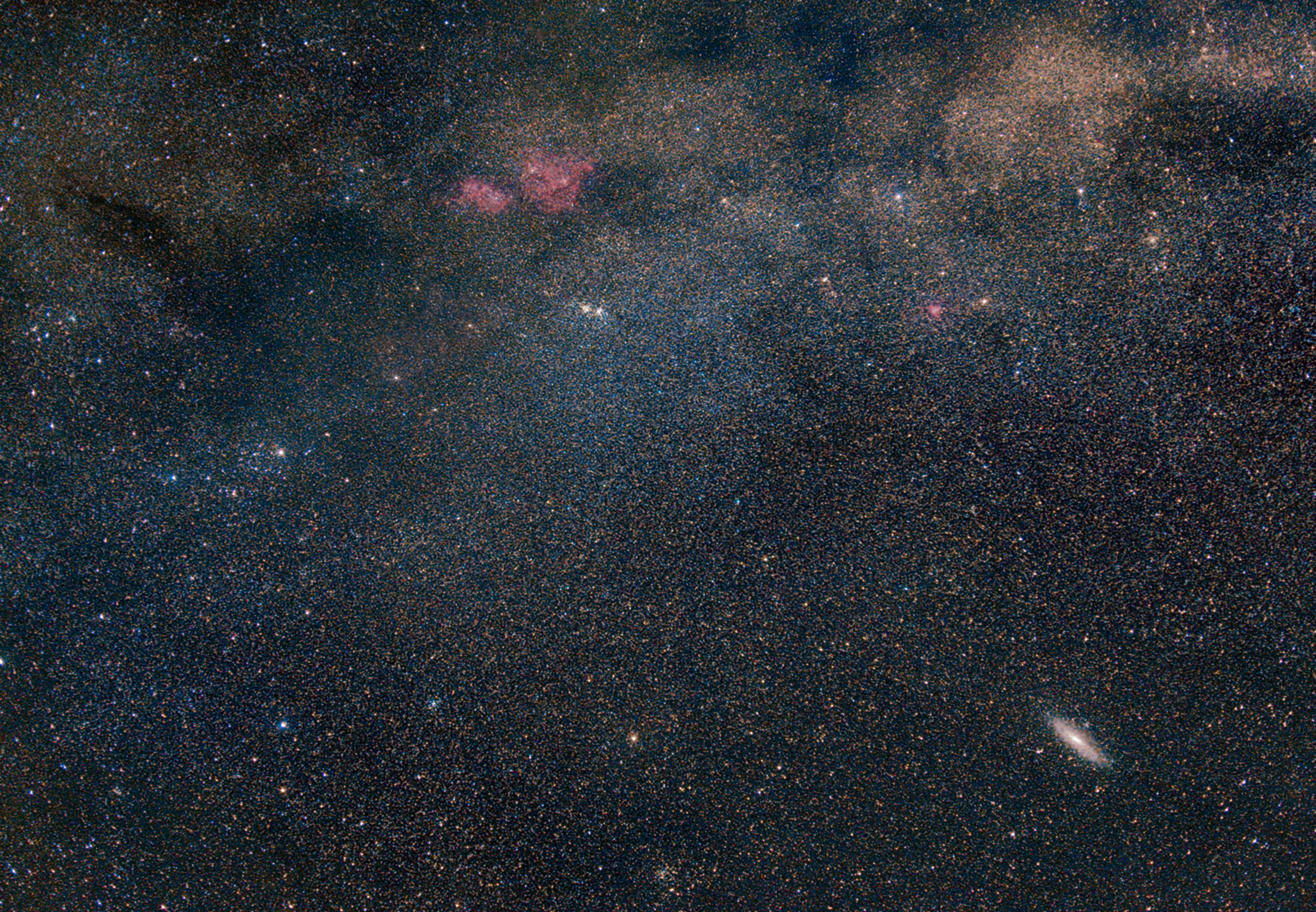 Während mein Teleskop die ganze Nacht Messier 33 aufgenommen hat, habe ich wieder meine Minimalausrüstung (600D, 24 mm, Videostativ) aufgestellt und die Milchstraße in der Kassiopeia-Gegend fotografiert. Ich habe es diesmal mit 15 statt 10 Sekunden probiert, aber das war schon ein kleines bisschen zuviel. Nach der etwas mühsamen Bearbeitung hatte ich genug vom Stillstand und gleich einen Omegon Minitrack LX2 bestellt.