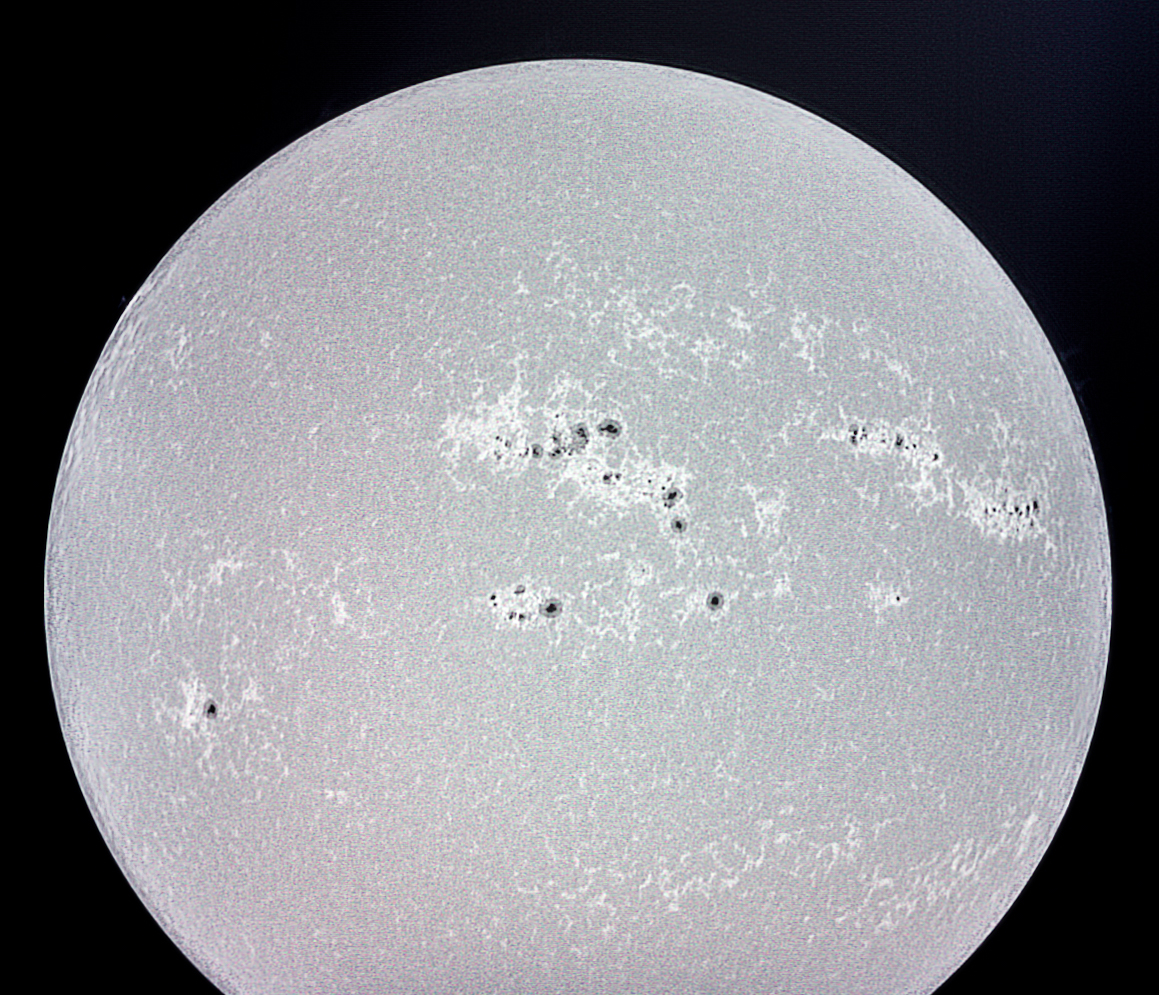 Könnte wohl auch eine verirrte Schrotladung aus der Flinte von Bat Masterson, Country Sheriff in Dodge City sein, welche er unbewusst im Herbst 1877 abfeuerte und welche nun endlich da oben angekommen ist … aber wohl unwahrscheinlich bei der Schwarzpulverladung von damals. Als ich dieses AVI in der Mittagstunde aufnahm, war die Luftunruhe sehr hoch und ich war total geblendet, so dass ich die Sonne sehr schlecht zentriert habe … schade, aber die »Einschüsse« sind ja zu sehen.