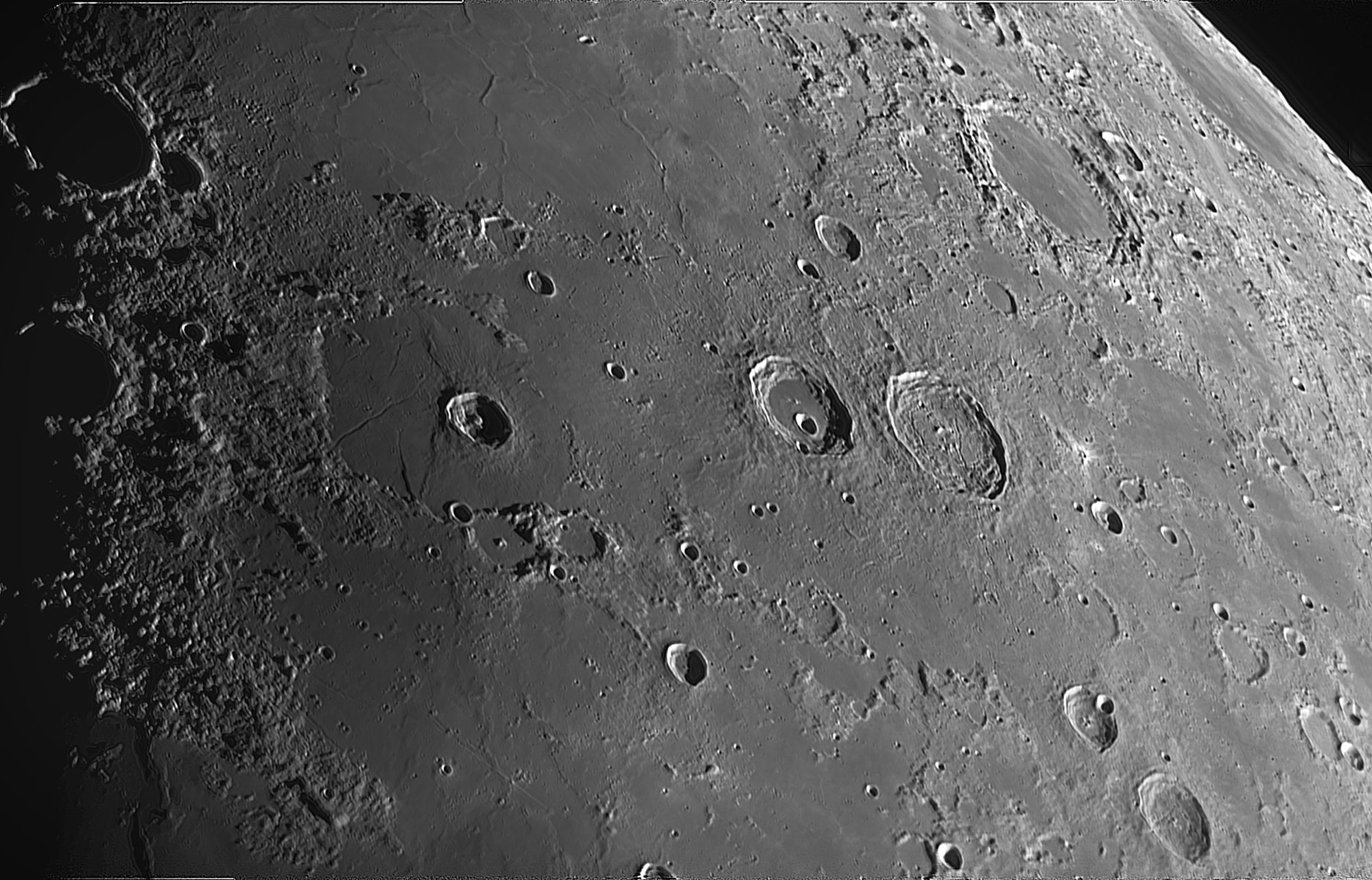 Hier noch ein Bild mit einigen Rimae (Daniell, Bürg, Atlas) und unter anderem dem glatten Kraterboden des Endymion, der nur wenige Kleinkrater aufweist.
