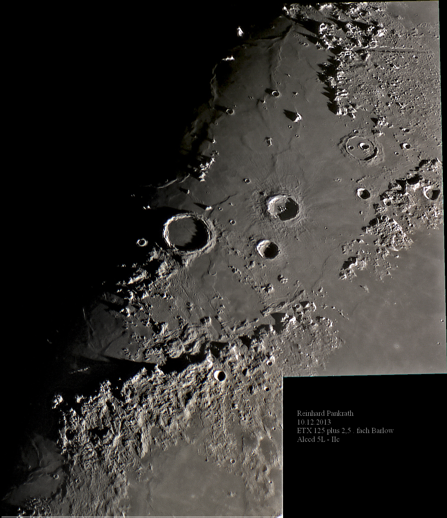Aus zwei hier bereits eingestellten Bildern habe ich ein Mosaik erstellt. Die Gebirgsregion mit Archimedes ist doch sehr eindrucksvoll und plastisch. Auch eine Vergrößerung des Bildes ist problemlos möglich. Beide Bilder im Zusammenhang (inkl. des Mosaiks) findet man auch größer auf www.astro.pankrath.eu.