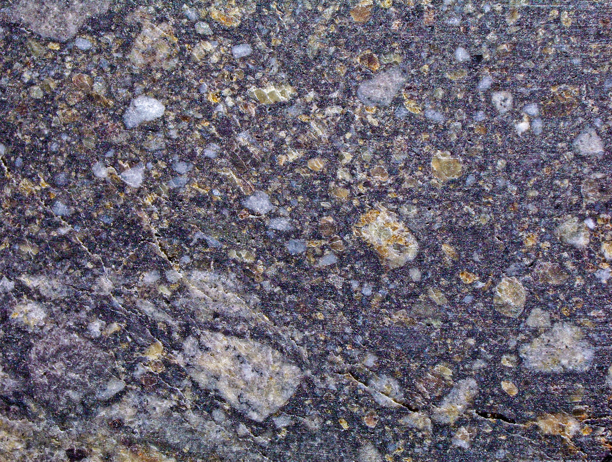 Offizieller Name des Mondmeteoriten: NWA 10203. Gefunden 2015 in Mauretanien (Nordwest Afrika). Es handelt sich um eine polymikte Brekzie (Olivin-Gabbro, Olivin mit Klinopyroxen, Plagioklas und wenig Titanomagnetit). Gesamtgewicht: 27 Stücke von zusammen 3,3 kg. Gewicht dieses Meteoriten: 1,85 g. Bildausschnitt 12 mm.