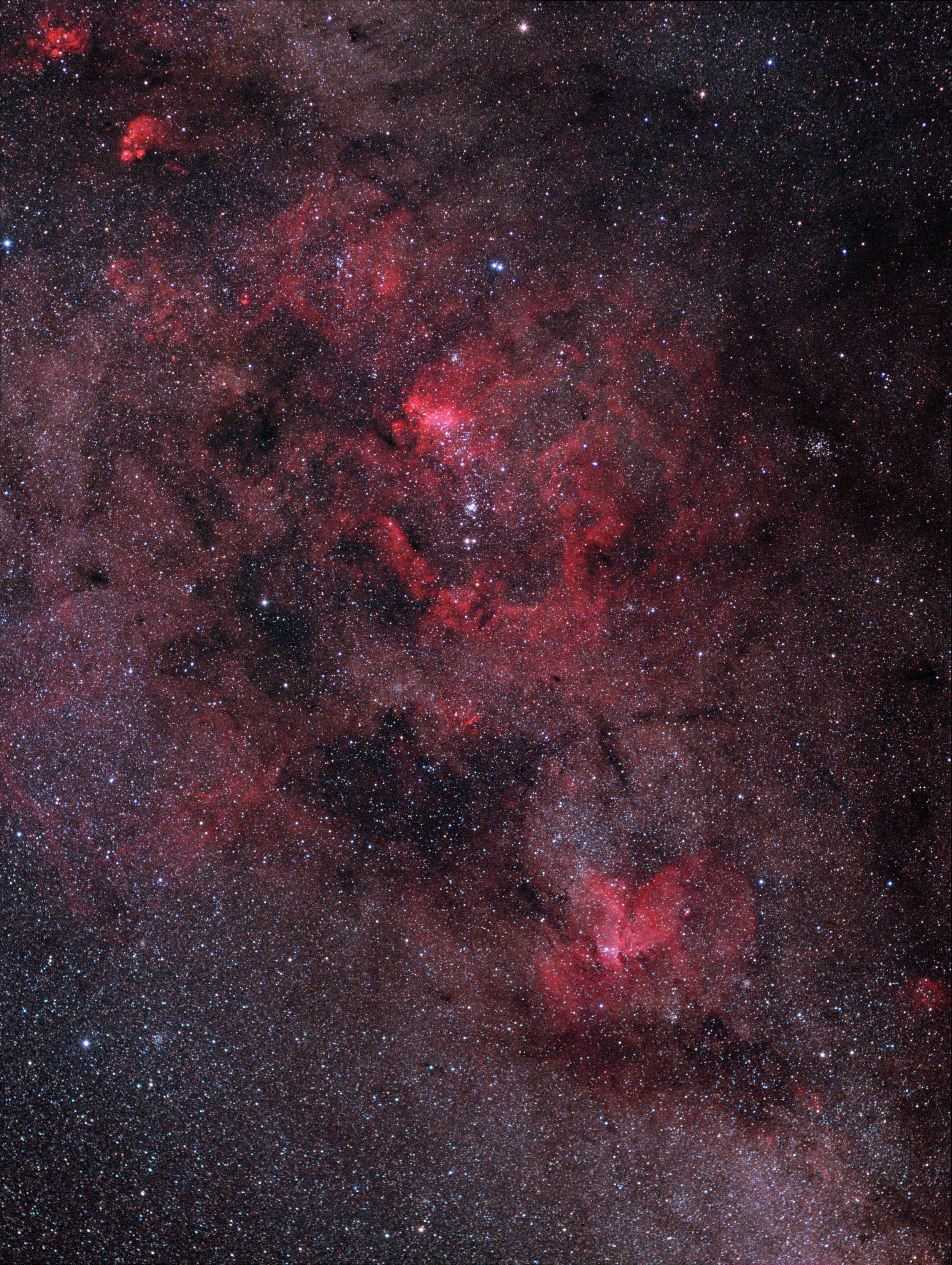 Der südliche Skorpion beherbergt ein ganzes Nest von interessanten Emissionsnebeln. Das Bild ist zentriert auf zeta Scorpii, Norden ist oben. Von oben links finden sich NGC 6357 (Rosen- oder auch Hummernebel), NGC 6334 (Katzenpfotennebel), ´NGC 6302 (Bugnebel, ein PN), IC 4628 (Krabbennebel), GN 16.45.0 (rund um zeta Scorpii) und schließlich GN 16.35.0 (der Feuervogel). Bei genauerem Hinschauen finden sich noch dutzendweise weitere Nebel.