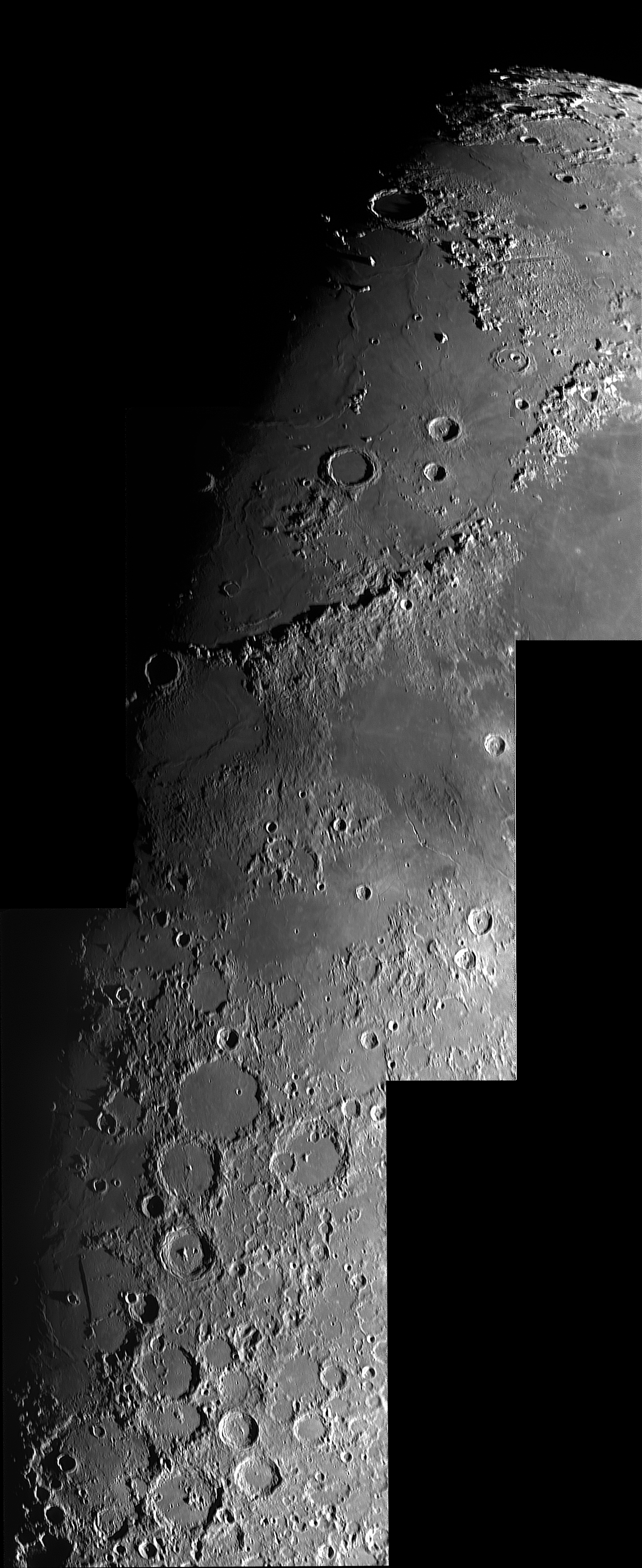 Eigentlich wollte ich ein komplettes Mosaik zusammen stellen mit meinem "Kleinen" (140 / 2000 mm). Leider war das Zeitfenster zwischen den Wolkenbänken nicht ausreichend lang, um mehr zu machen. Bei diesem Sonnenstand sind die Verwerfungen im Mare Inmbrium und entlang des Terminators schön zu sehen. Daher kann man auch diesem unvollständigen Bild etwas abgewinnen …